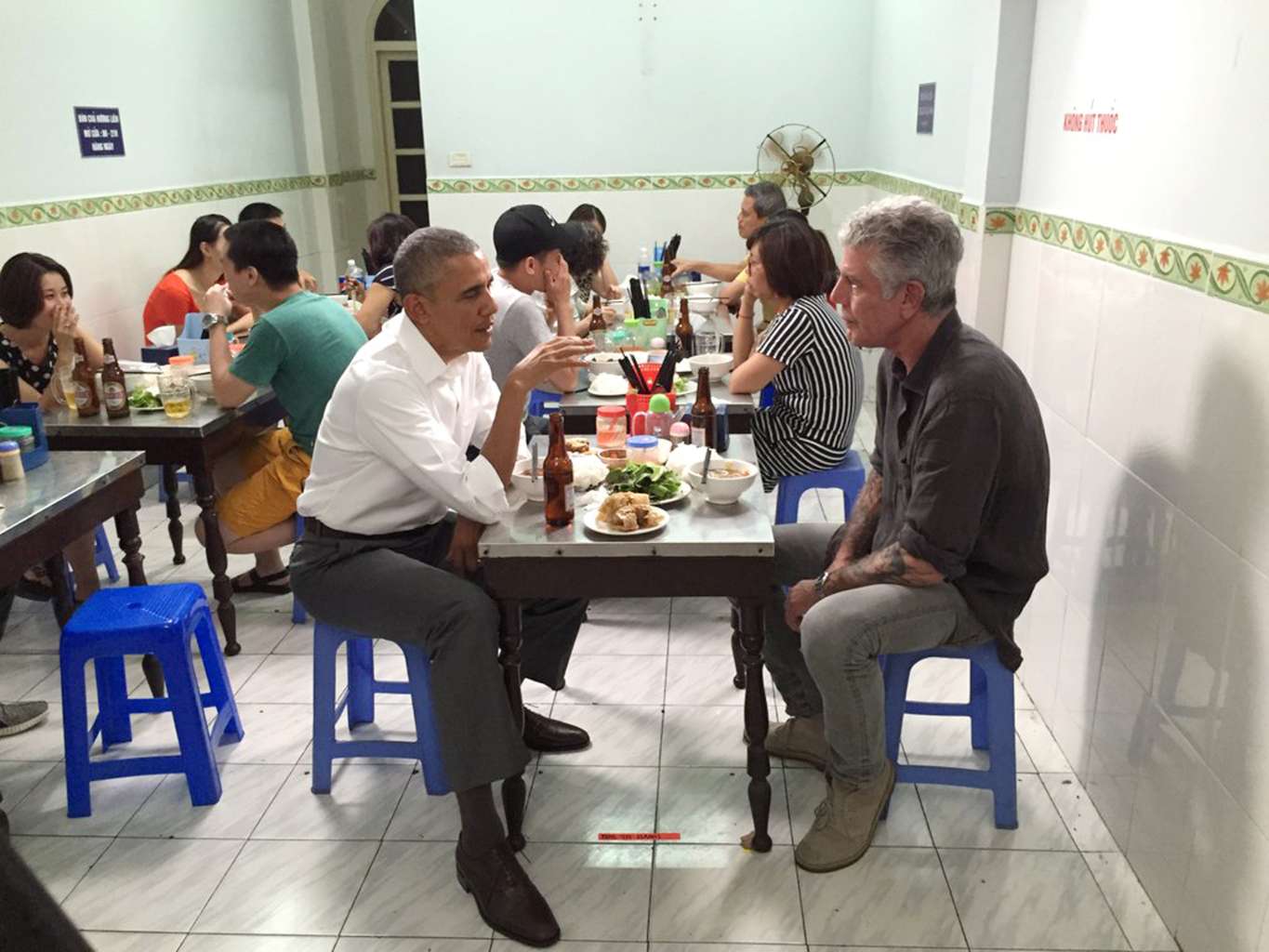 It was a rare sight - US President Barack Obama sitting on a flimsy plastic stool, having a simple Vietnamese meal in a Hanoi restaurant with celebrity chef Anthony Bourdain.