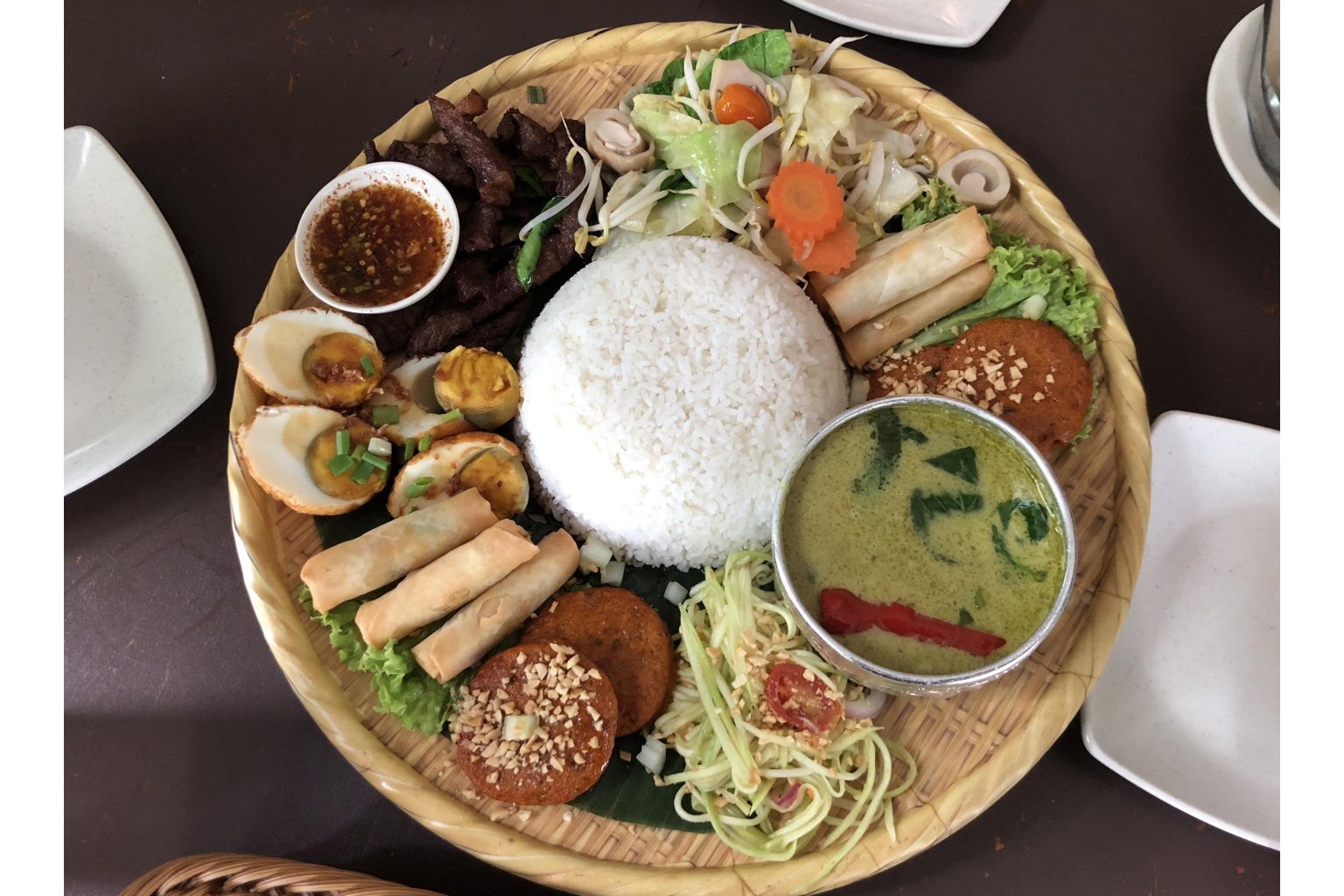 The Rice Platter has green curry with chicken, mango salad, vegetables, beef, spring rolls, fish cakes and eggs.