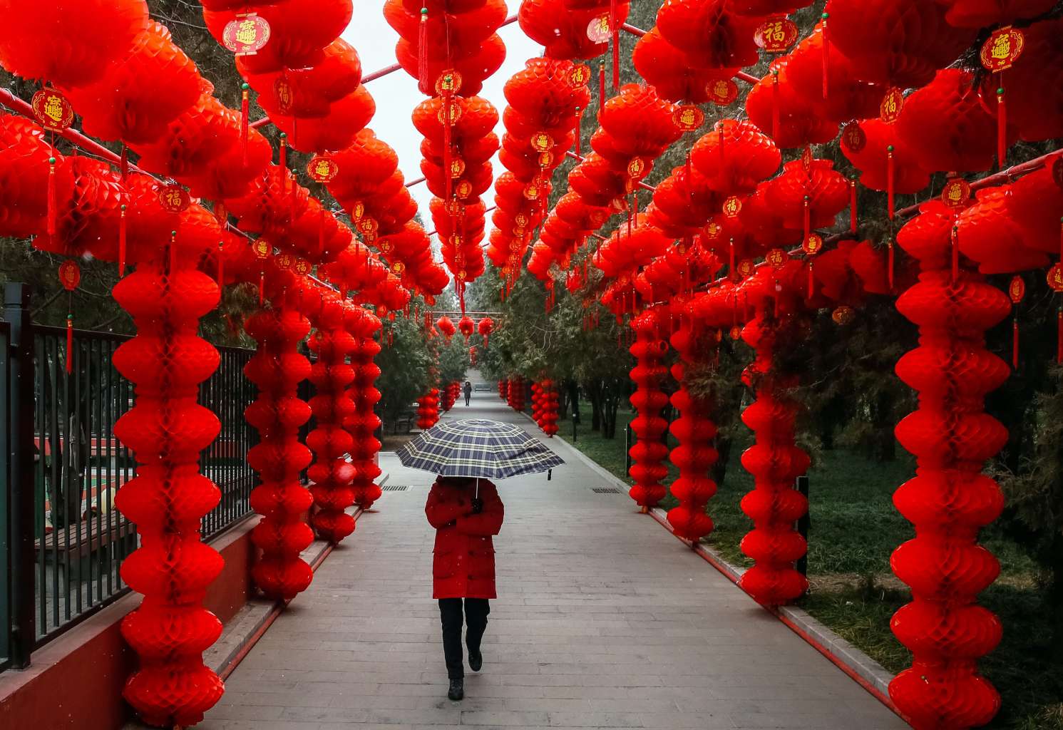 A woman with an umbrella passes by red lanterns put up at Ditan Park in Beijing to celebrate Chinese New Year, on Jan 16.