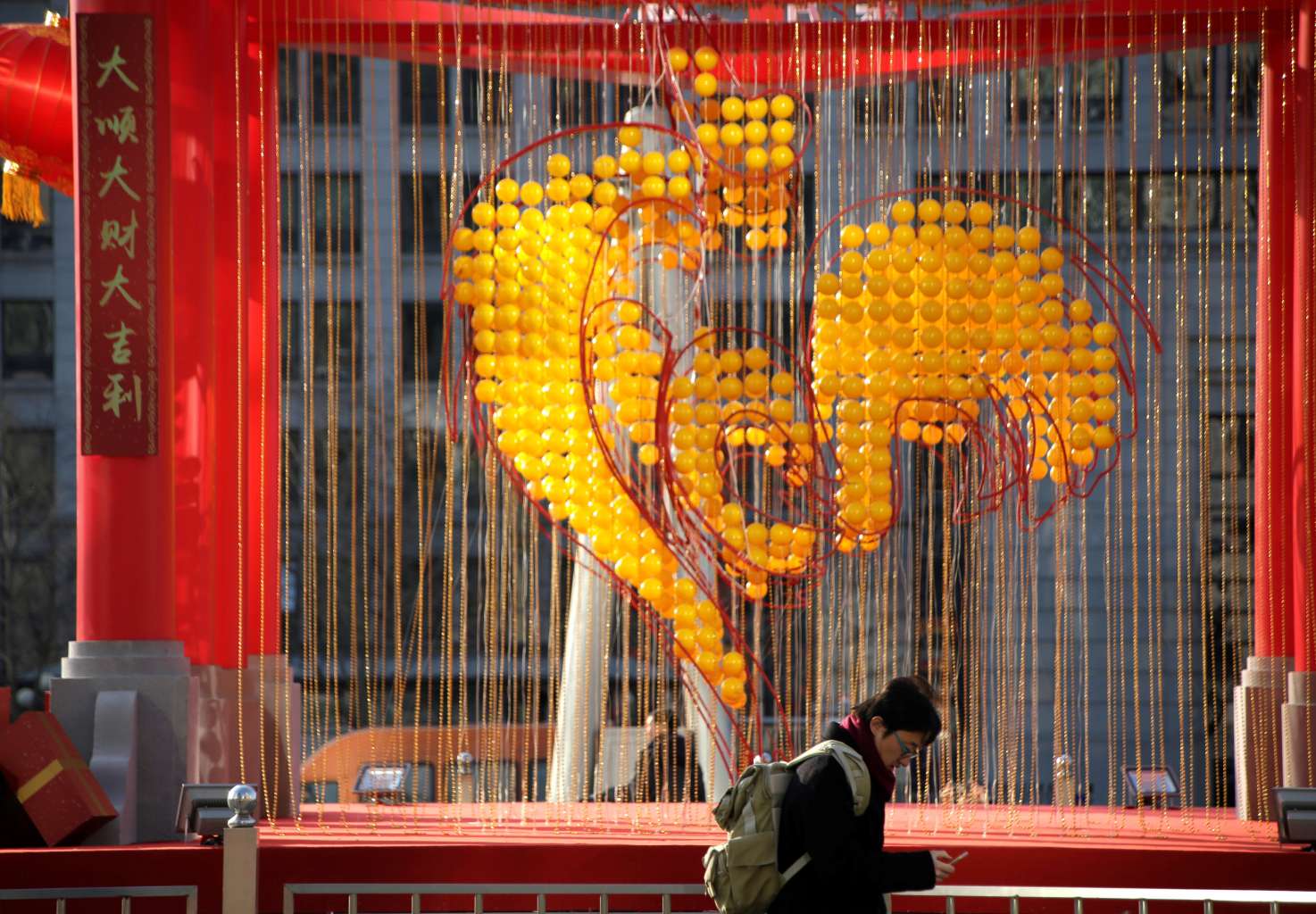 Decorations are placed to celebrate the Year of the Rooster at Oriental Plaza in Beijing, China in this photo taken on Jan 18.
