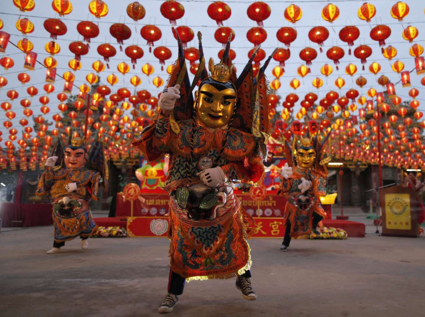 Thai performers, dressed in costumes as Nezha - a Chinese deity - dancing to mark the start of Chinese Lunar New Year celebrations at Siam Tai Tien Kong shrine in Samut Prakan province, on the outskirts of Bangkok, Thailand, on Jan 21.