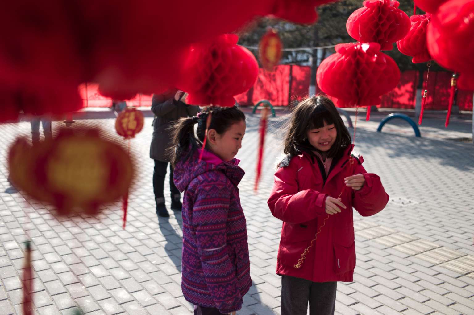 Children stand near a lantern tree display ahead of Chinese New Year in Beijing on Jan 24. Chinese New Year is known locally as the Spring Festival.