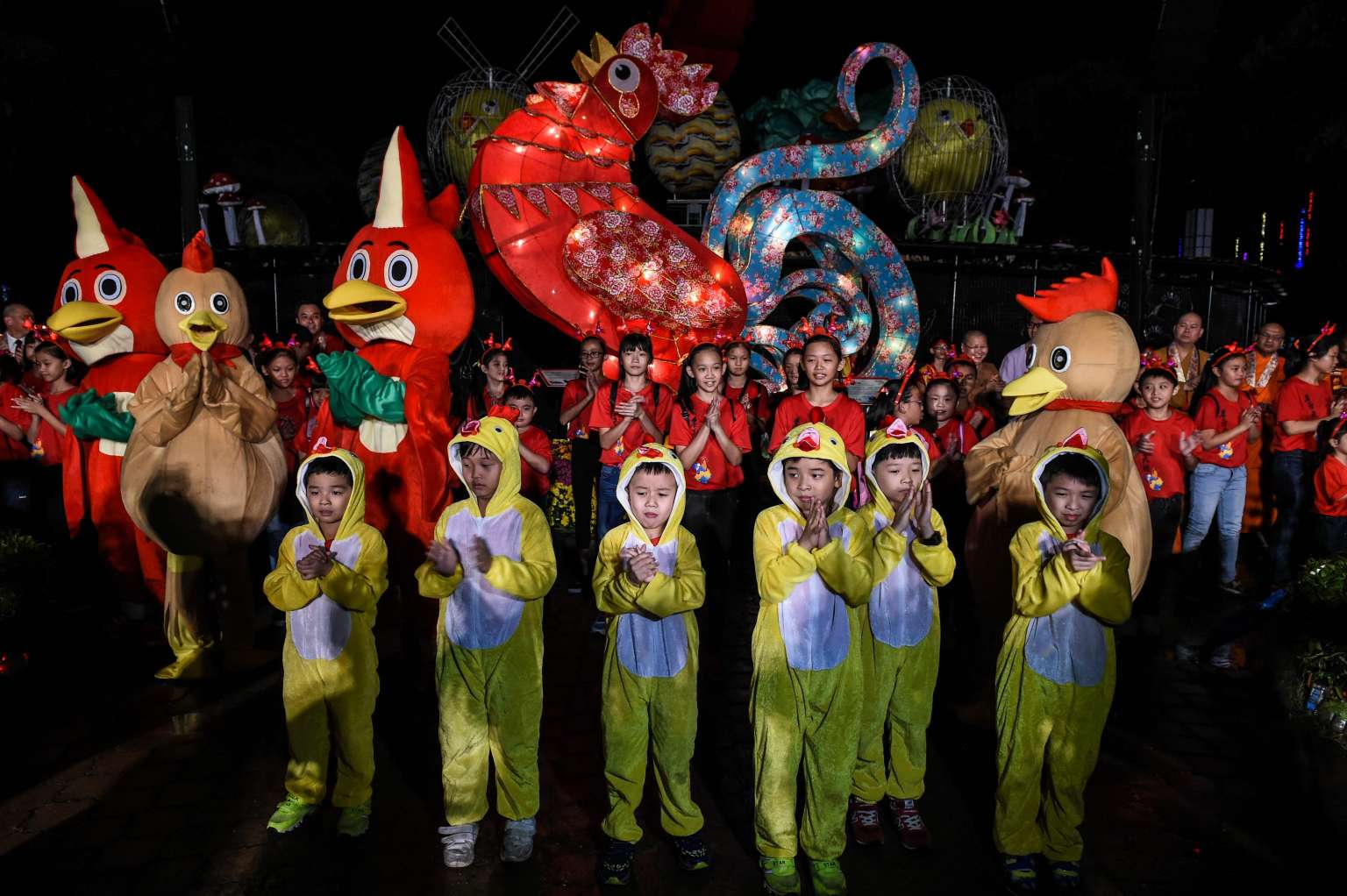 Children in rooster costumes dancing during the opening ceremony of the Lantern and Flora Festival ahead of the Chinese New Year celebrations at Fo Guang Shan Dong Zen Buddhist Temple in Jenjarom, west of Kuala Lumpur, on Jan 25.