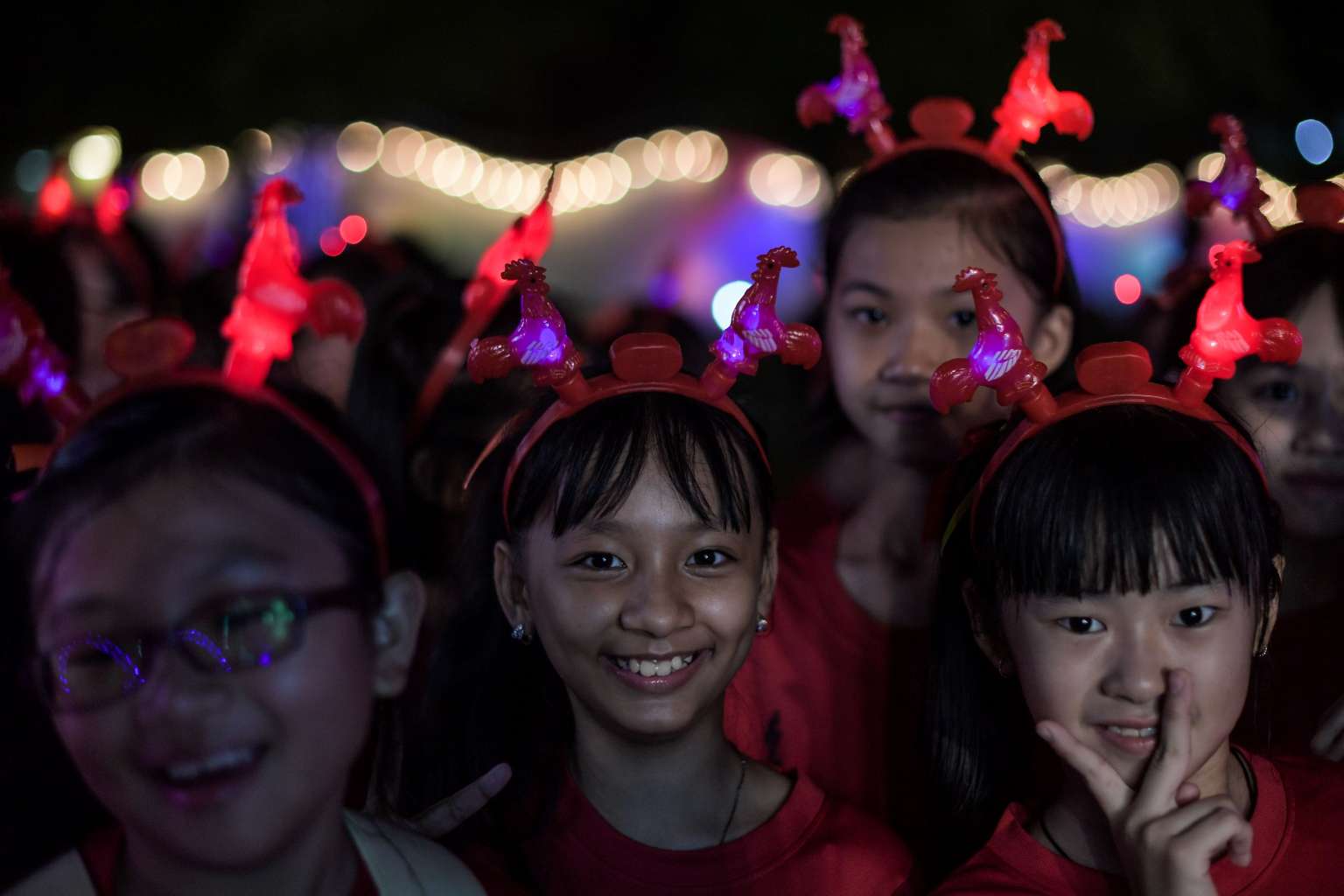 Girls wear illuminated rooster headgear during the opening ceremony of the Lantern and Flora Festival ahead of the Chinese New Year celebrations at Fo Guang Shan Dong Zen Buddhist Temple in Jenjarom, west of Kuala Lumpur, on Jan 25.