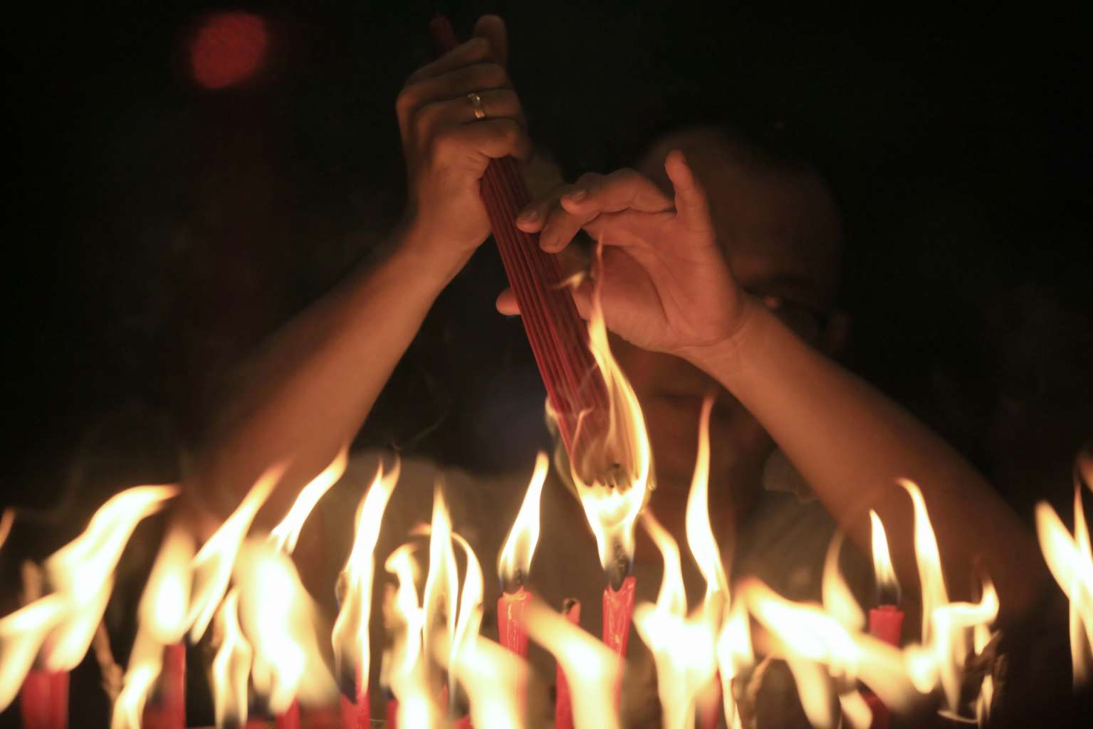An Indonesian worker arranges giant incense sticks during the Chinese New Year celebrations at the Pak Pie Hut Cou temple in Medan, North Sumatra, Indonesia, on Jan 28.