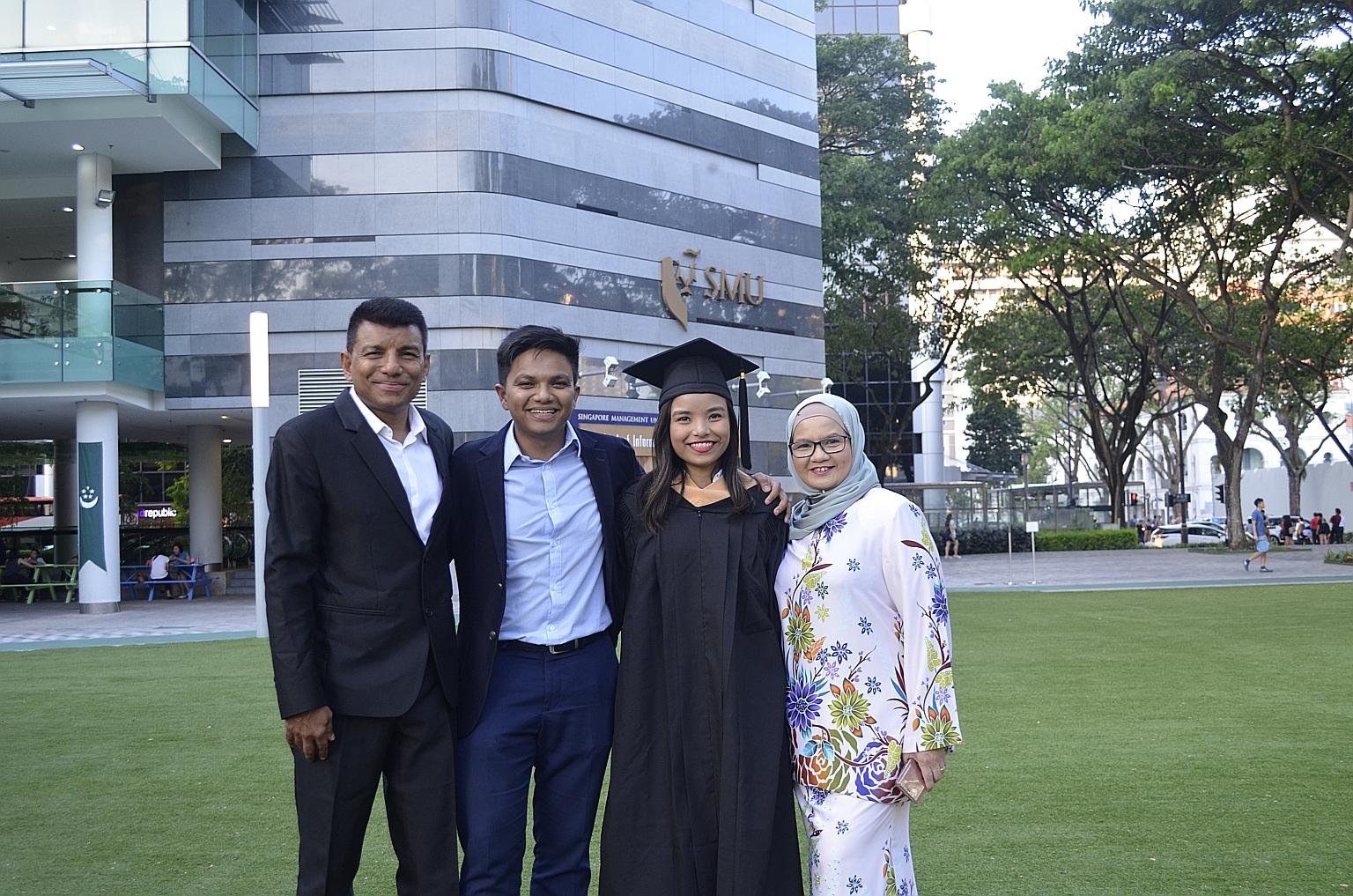Ms Farah Malik (third from left) with (from left) her father, Mr Malik Shah, her brother, Mr Faris Malik, and her mother, Madam Fatimah Alwi, at her graduation ceremony. The siblings started a social enterprise that aims to provide students with affordable tuition services.