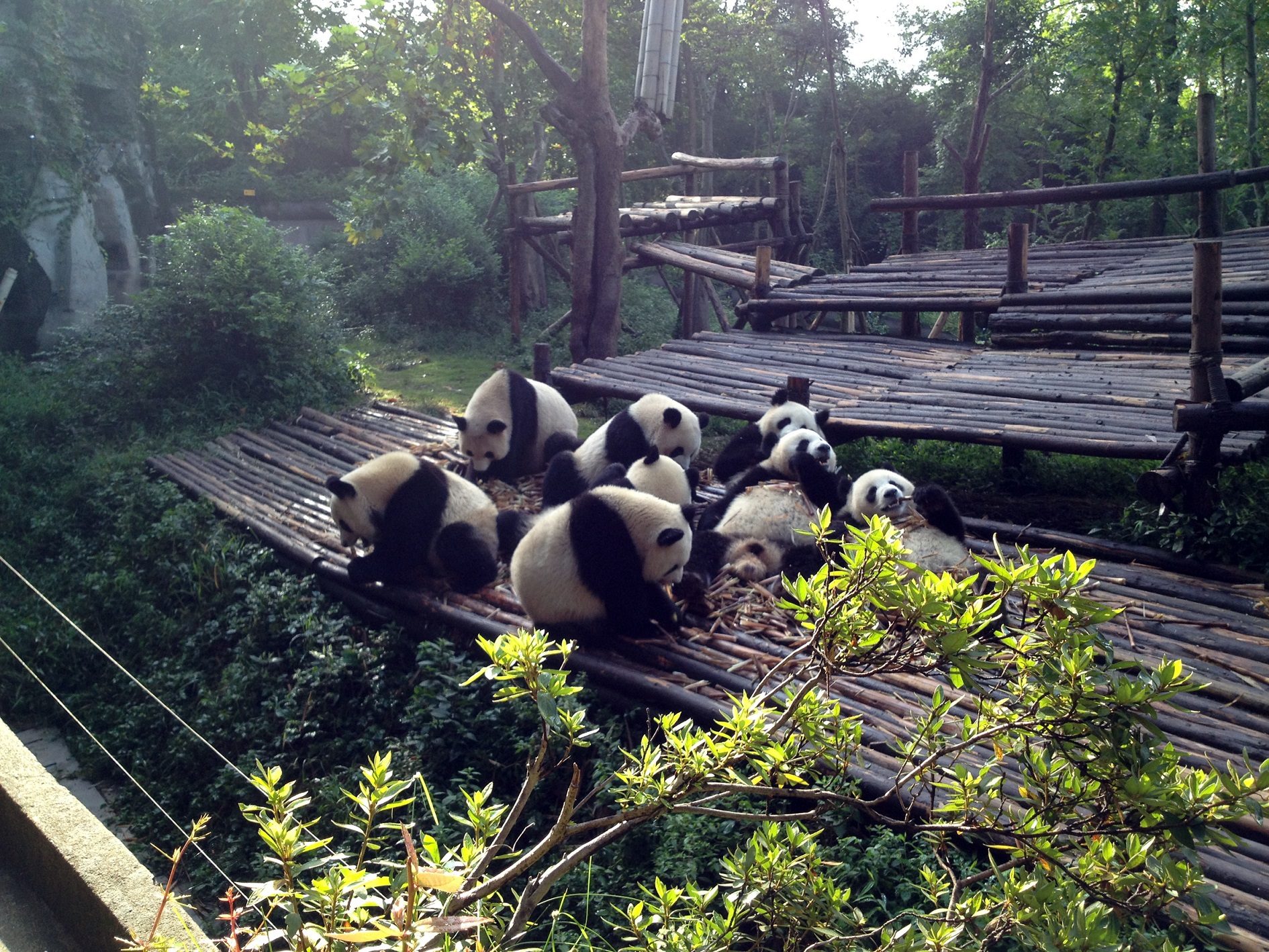 Eight young giant pandas at the Chengdu Research Base of Giant Panda Breeding in Chengdu, Sichuan, China.