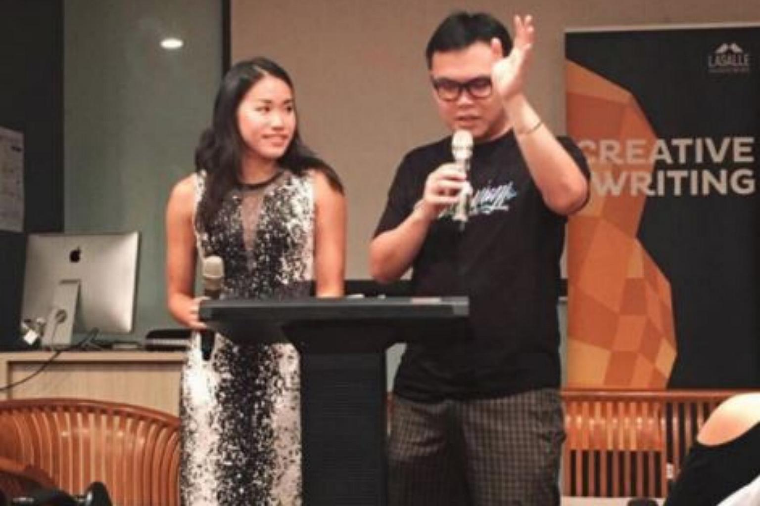 Poets Joshua Ip and Amanda Chong performing a poem at the Sing It! Singapore's All-Star Poetry Reading event on Sept 27, 2017, at LASALLE College of the Arts.