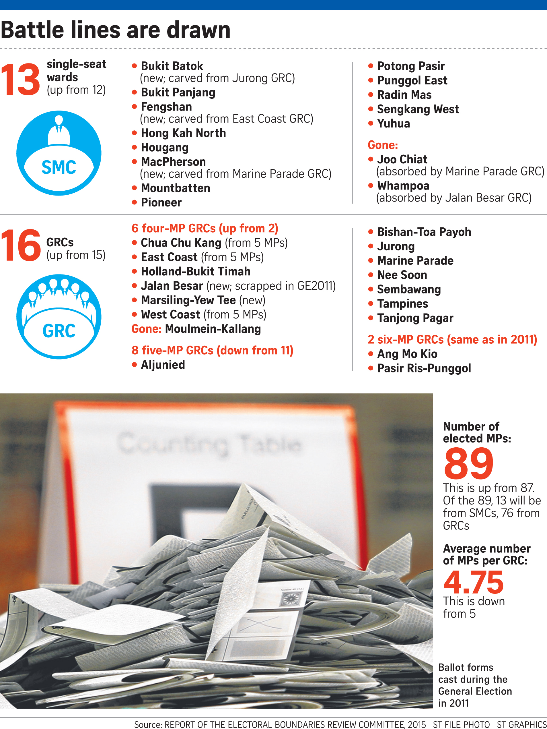 They also continue reforms to the system Prime Minister Lee Hsien Loong had initiated ahead of the 2011 General Election, to reduce the average size of a Group Representation Constituency (GRC) and have more Single-Member Constituencies (SMCs).