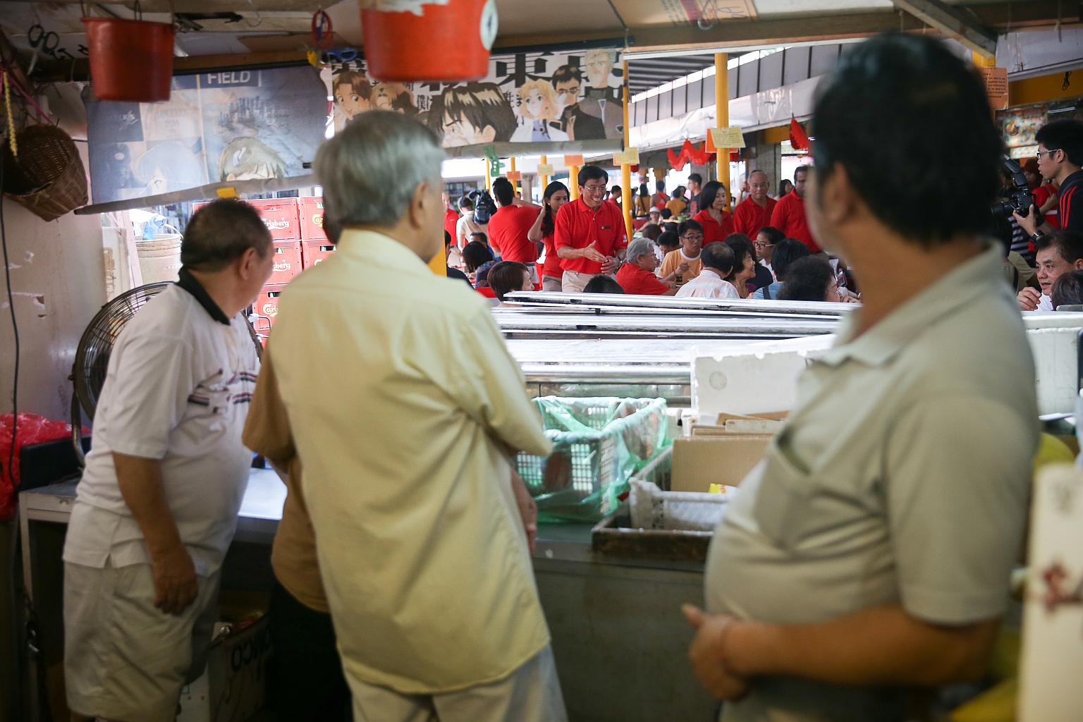 Fruit sellers watching as Dr Chee Soon Juan goes on a walkabout greeting residents in Bukit Batok on March 13, 2016.