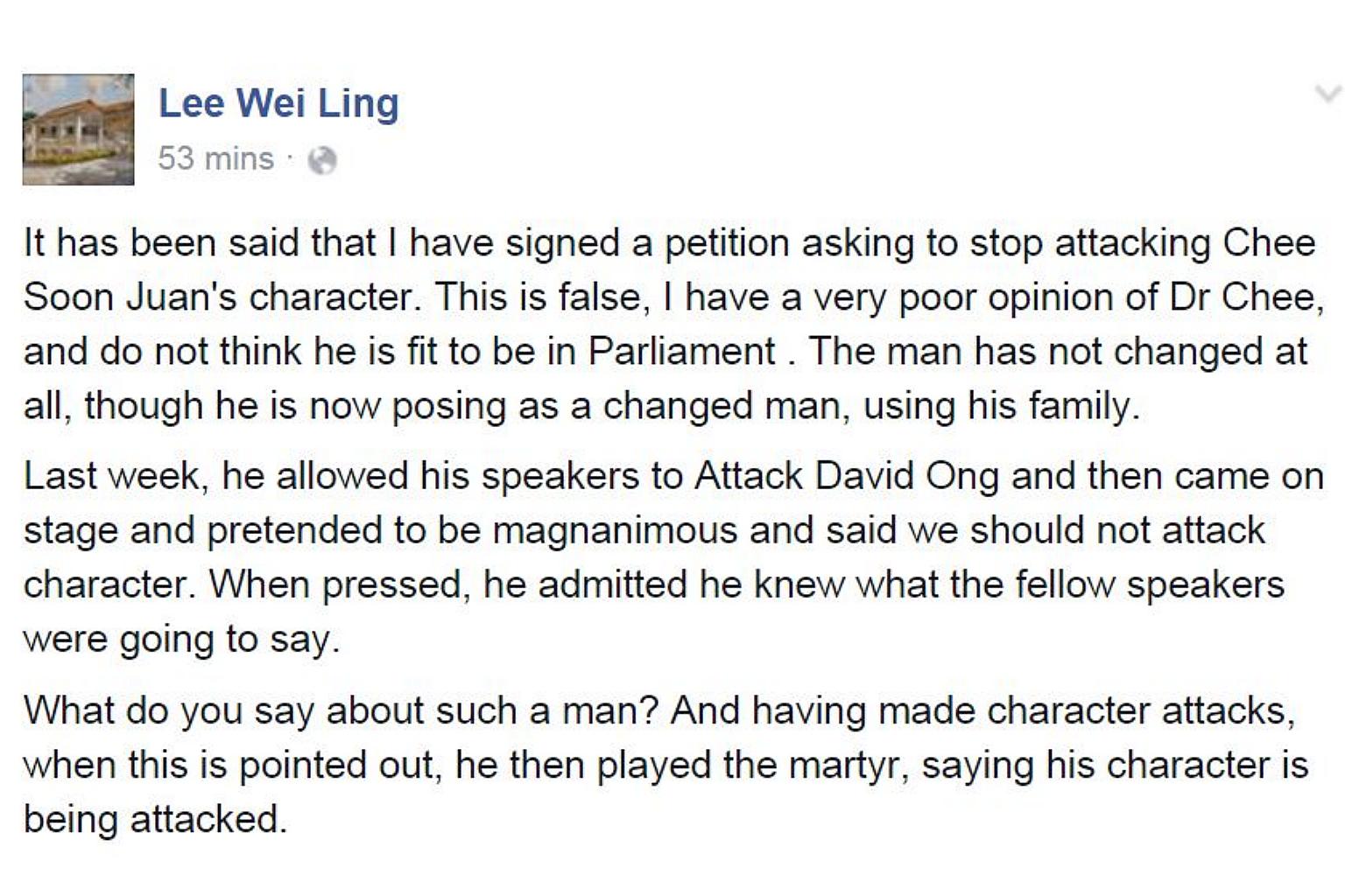 Dr Lee Wei Ling's Facebook post, which denied she had signed a petition calling for the personal attacks on SDP chief Chee Soon Juan to stop.