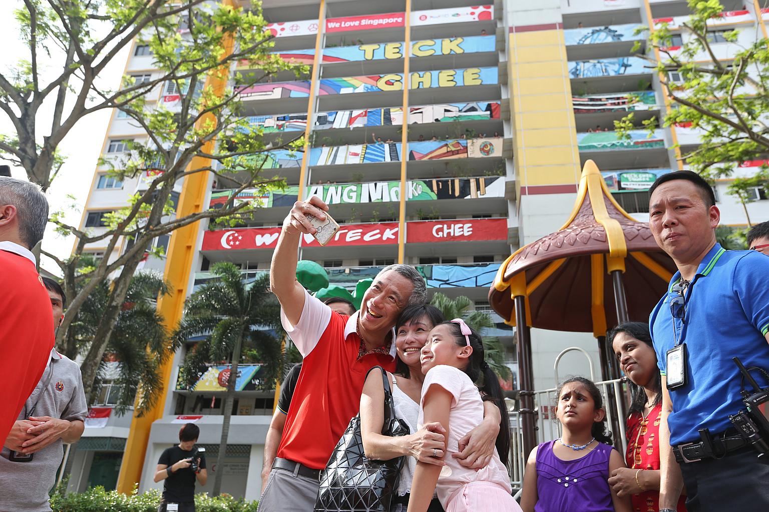 Prime Minister Lee Hsien Loong taking a selfie with residents at his Teck Ghee ward.