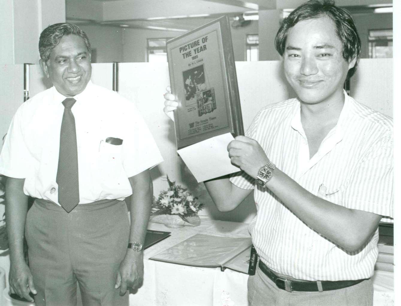 Mr S R Nathan, then executive chairman of The Straits Times Press, looks on as photographer H.L. Chan wins the ST Picture of the Year award in 1985.