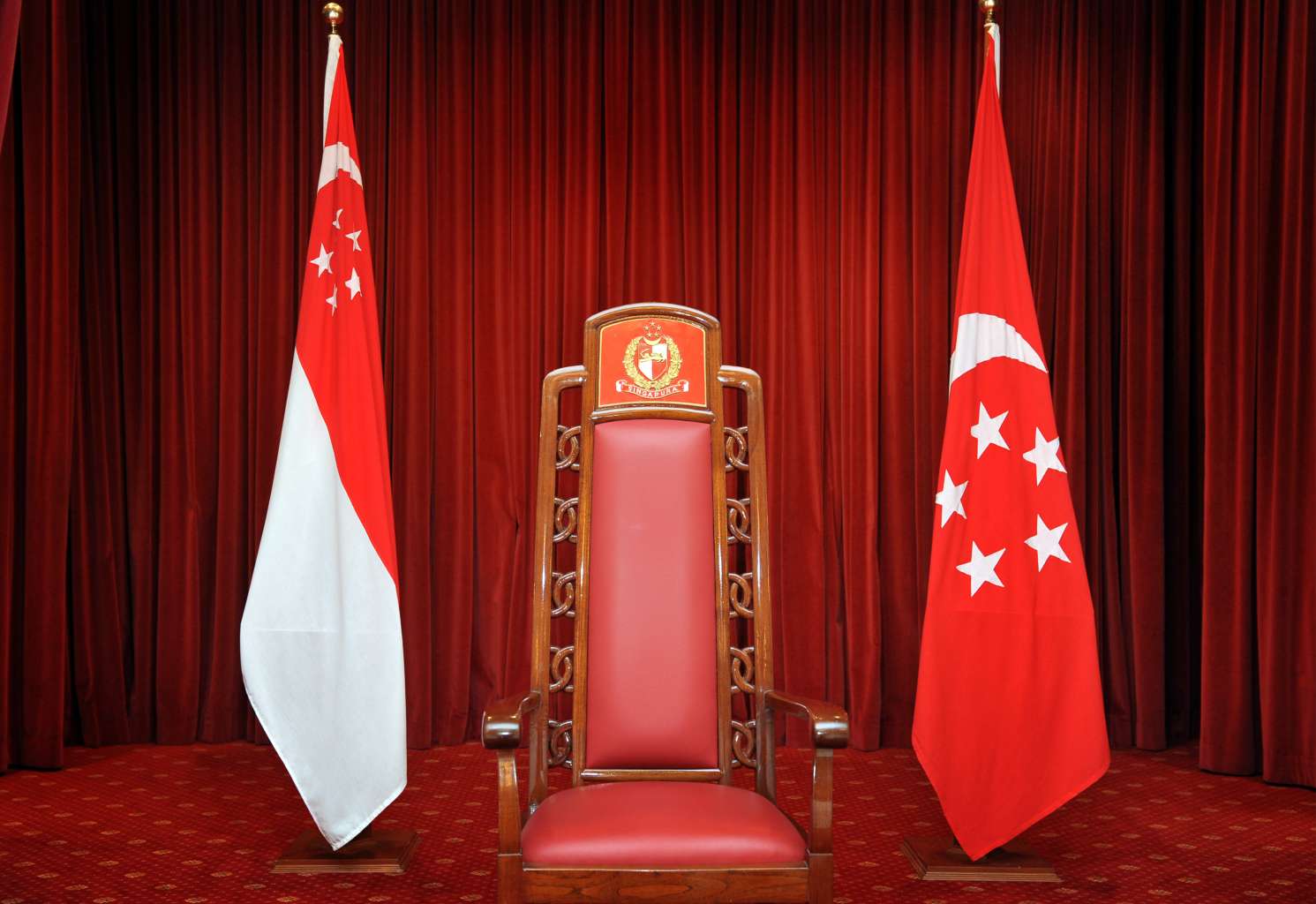 The Presidential chair flanked by the State Flag (left) and the Presidential Standard (right) at the Istana on Aug12, 2011.