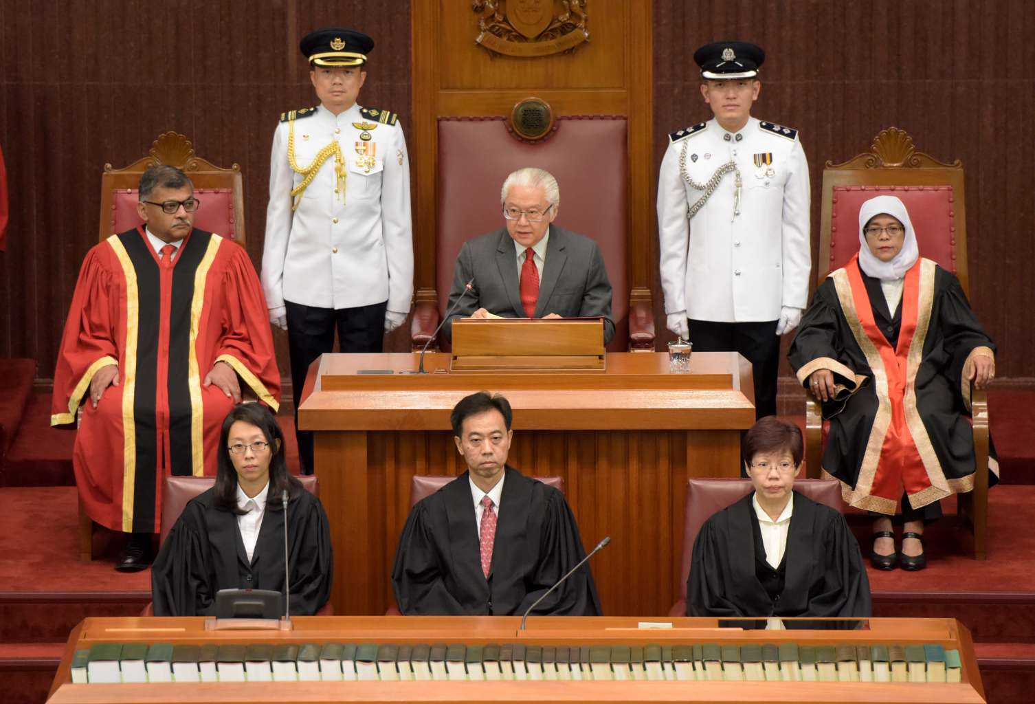 Singapore President Tony Tan Keng Yam (centre) opening the first session of the 13th Parliament, flanked by Chief Justice Sundaresh Menon (left) and Speaker of Parliament Halimah Yacob (right).