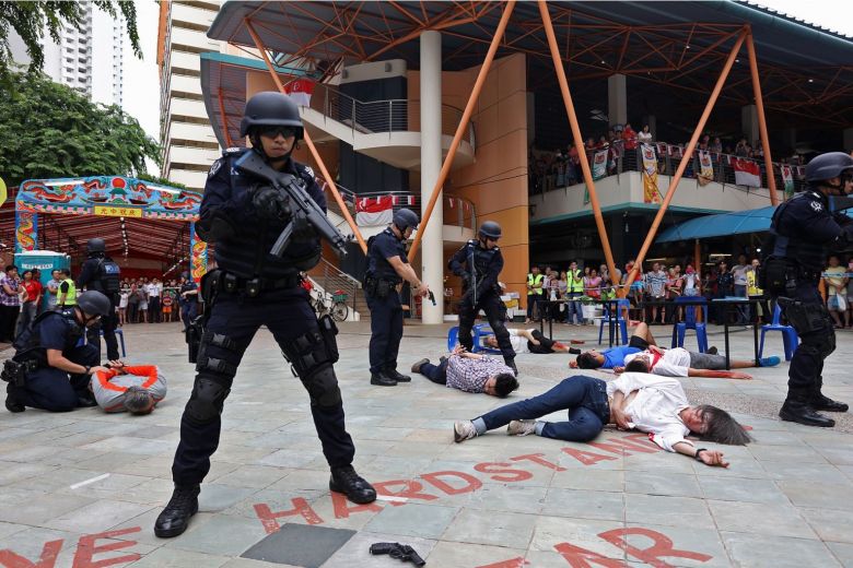 Officers from the Emergency Response Team, Tanglin Division and Ground Response Force from Toa Payoh Neighbourhood Police Centre during a counter-terrorism exercise, on Aug 6, 2016.