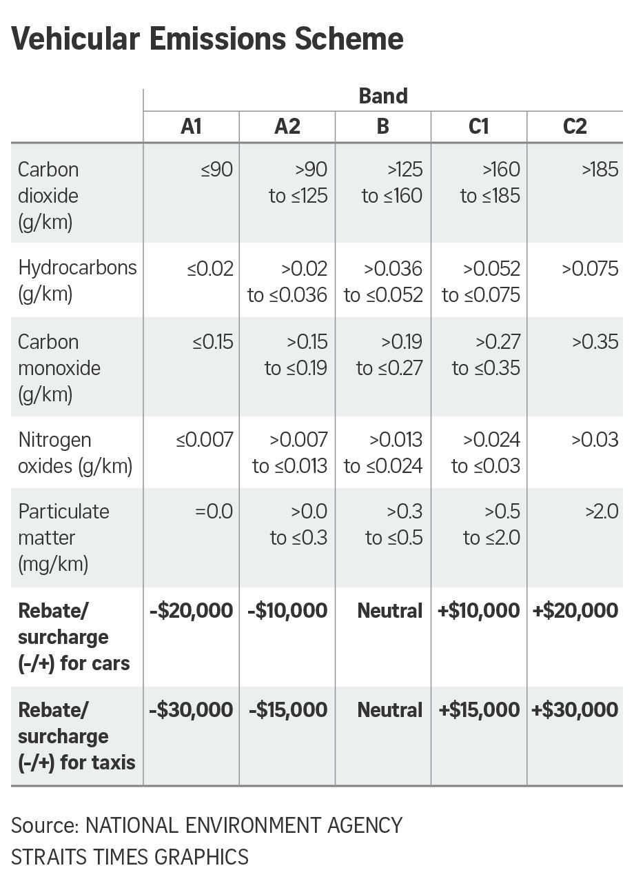 SINGAPORE - If buying habits remain unchanged, more car buyers and taxi operators will be liable for tax surcharges when a new Vehicular Emissions Scheme (VES) kicks in from Jan 1 next year.