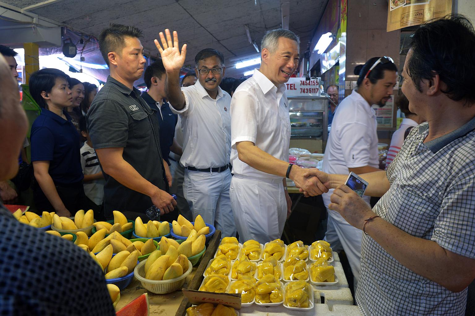 PM Lee Hsien Loong (third from right) during a walkabout in Bukit Batok with Mr Murali Pillai (fourth from right).
