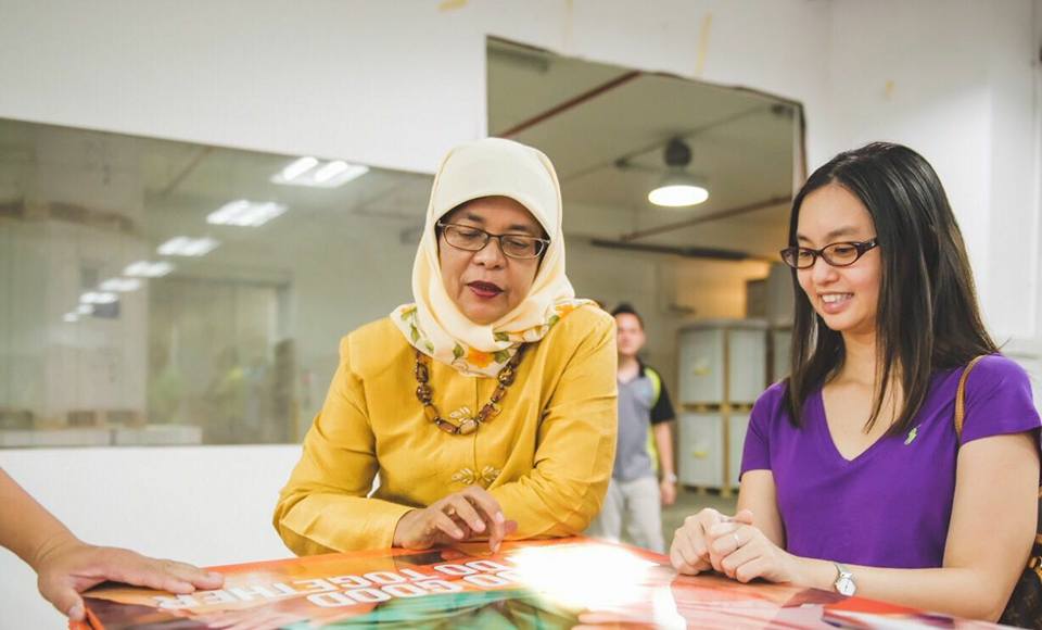 President Halimah Yacob looking at a poster for her presidential campaign. All unused donations will be returned to donors, a statement from her campaign team said today (Oct 7).