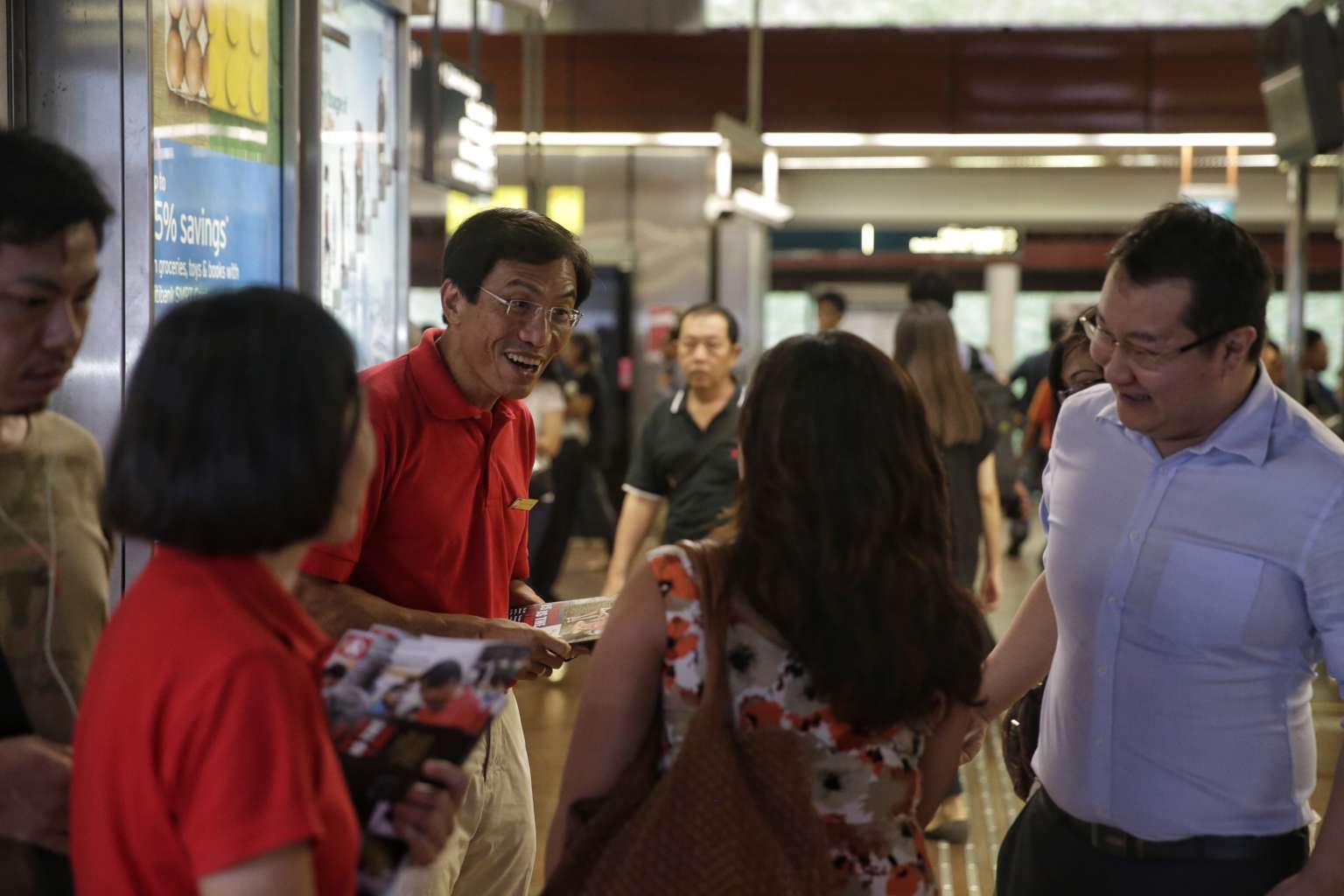 SDP chief Chee Soon Juan (in red shirt) hands out campaign leaflets at Bukit Batok MRT station on April 28, 2016.