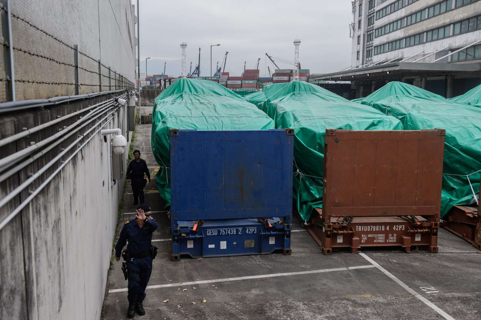 A member of security gestures near tarpaulin-covered armoured vehicles belonging to the Singapore military at a customs and excise facility in Hong Kong, on Nov 25, 2016.