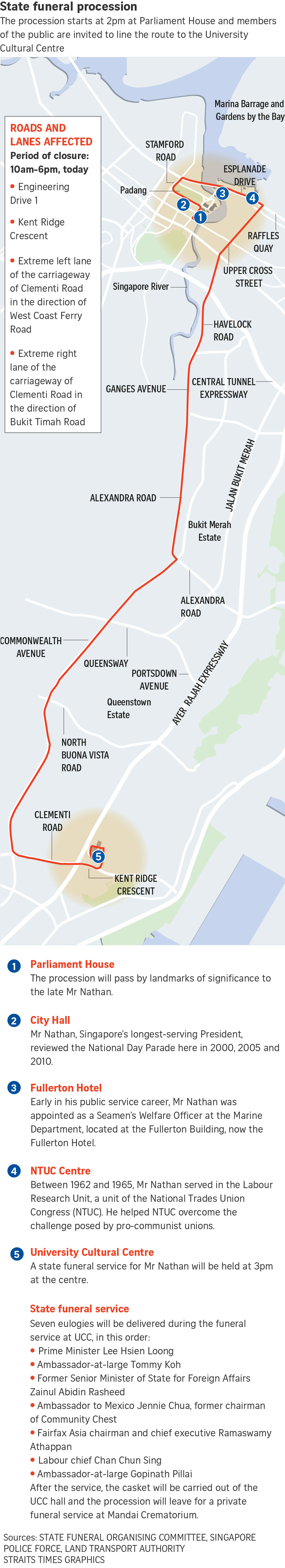 The state funeral procession for Mr Nathan today will start from Parliament House at 2pm. The ceremonial 25-pounder gun carriage carrying his casket will pass landmarks of significance to him, such as City Hall and NTUC Centre.