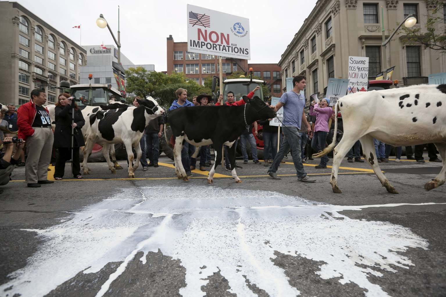 Dairy farmers walking their cows past milk thrown on the street during a protest against the Trans-Pacific Partnership (TPP) trade agreement in front of Parliament Hill in Ottawa, Canada, in late September. Liberalising farming sectors is a hot issue and Canada agreed to open up only a small percentage of its dairy market.