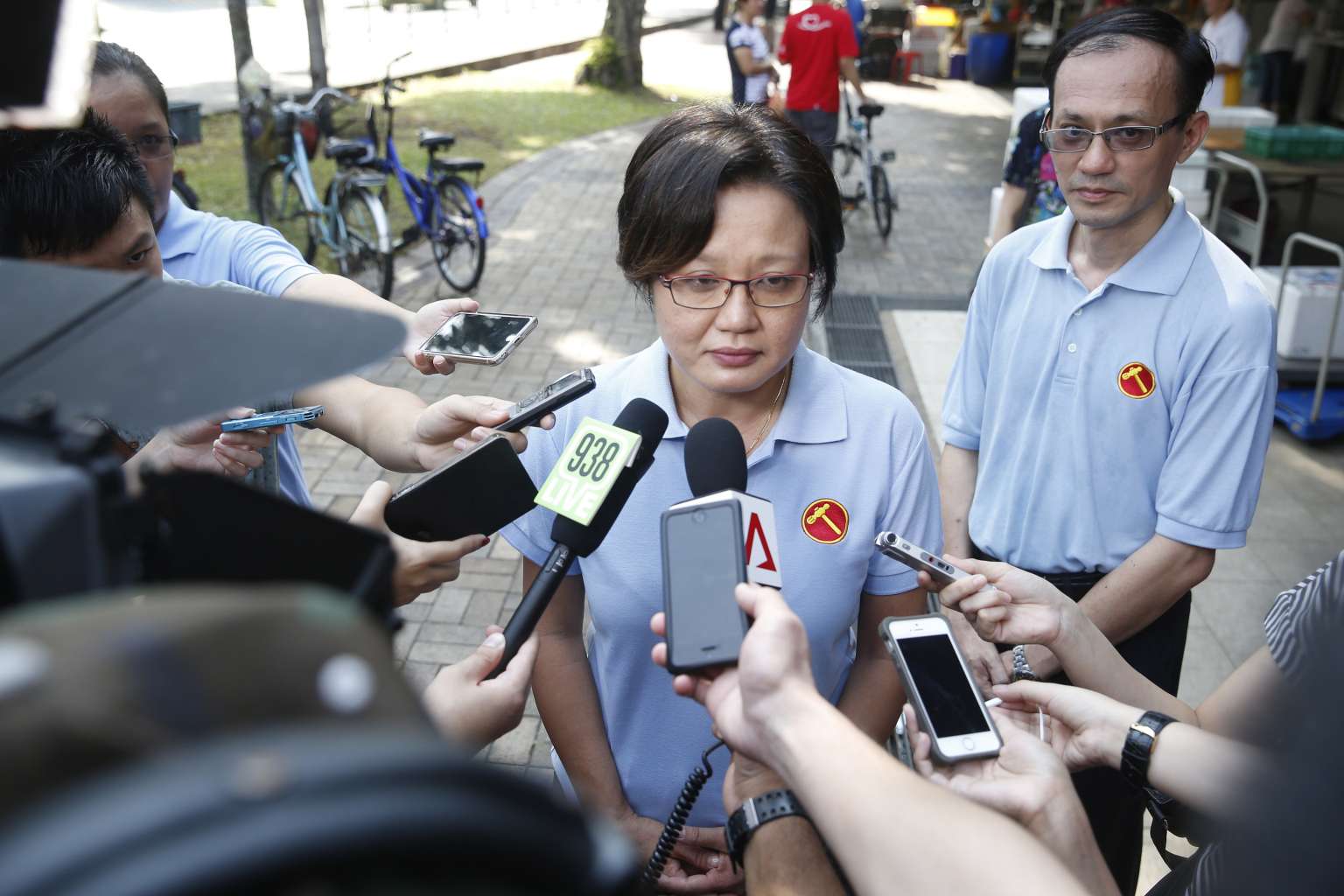 Workers' Party chairman Sylvia Lim speaks to the media during a walkabout at Macpherson Market and Food Centre on Aug 7, 2015.