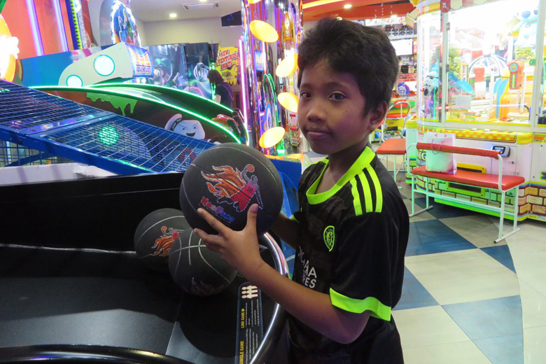 The basketball machine was Hilmi's favorite game at the arcade, and he also tried his hand at the claw machine and driving simulators.