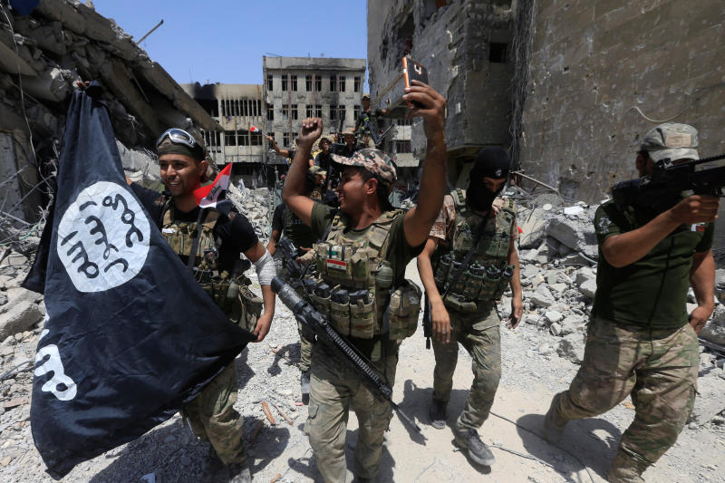 Members of the Iraqi Army seen with an ISIS flag in Mosul, Iraq, on July 8, 2017.