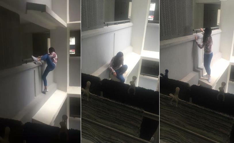 A neighbour spotted the girl on a ledge at the third-floor corridor, and took a video of it, Lianhe Wanbao reported on Monday.