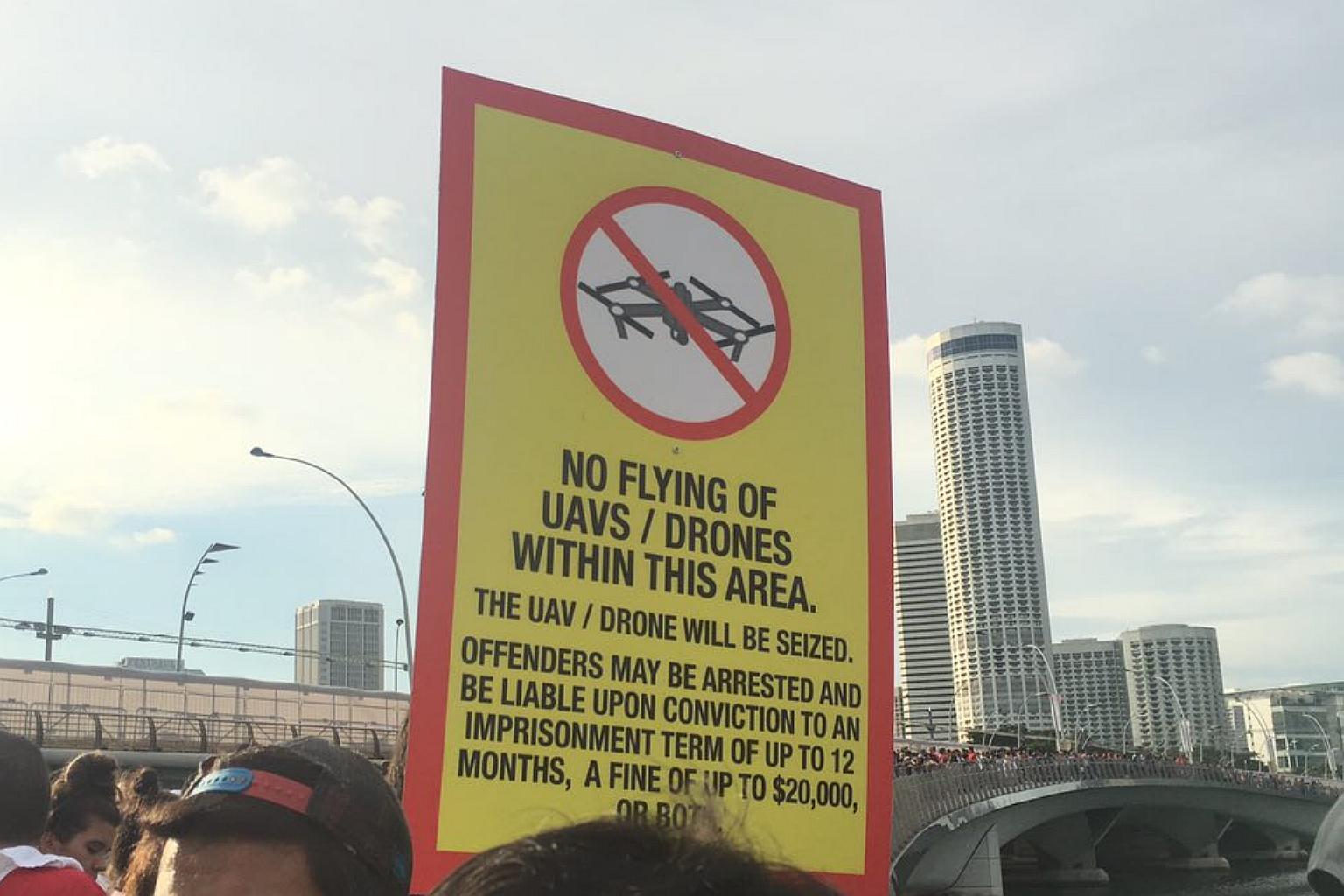 A sign warning people not to fly drones or UAVs near the National Day Parade, on Aug 9, 2017.
