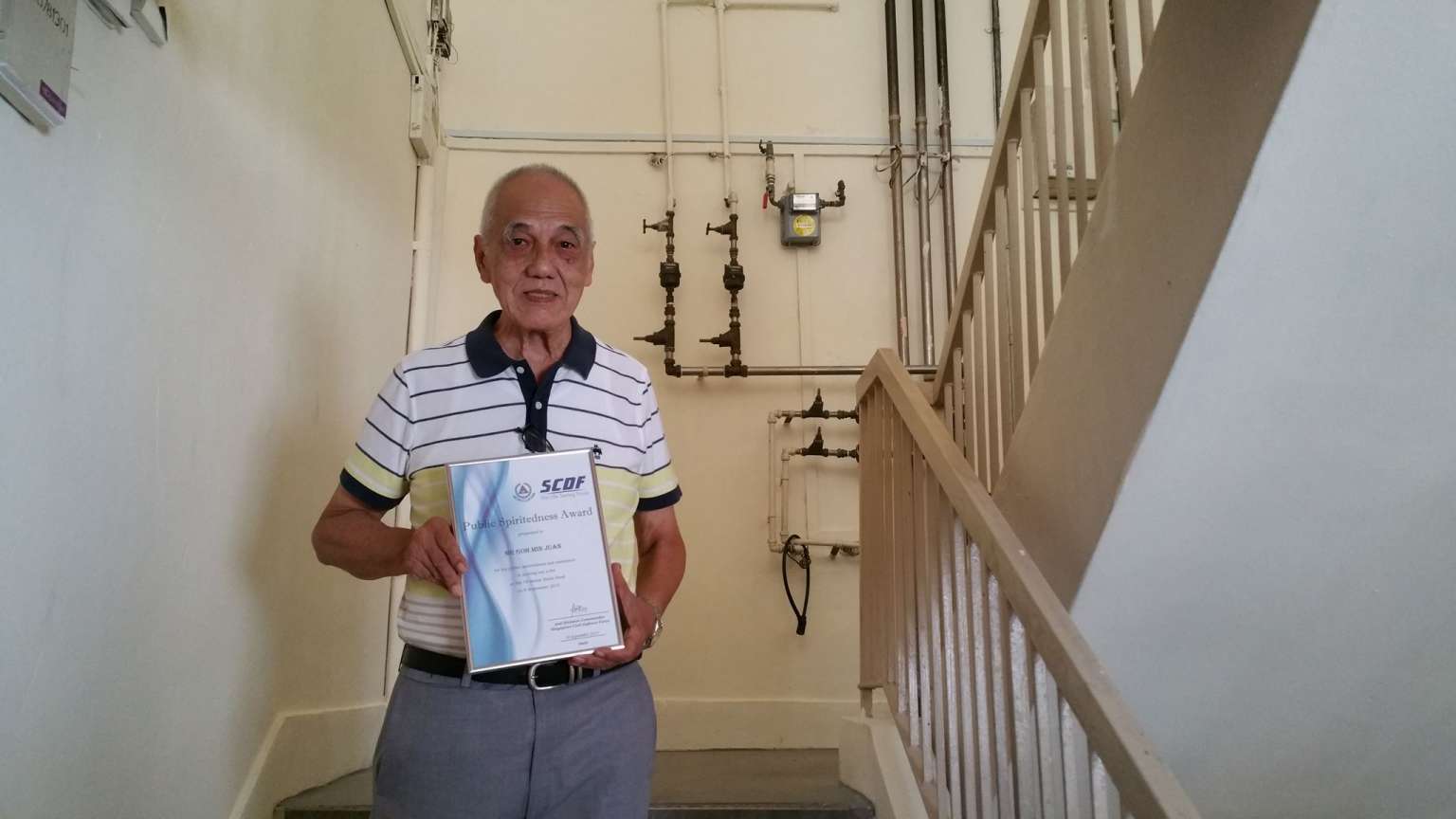 Mr Goh Min Juan, 76, ran up and down this flight of stairs with buckets of water to put out a fire outside his neighbour's corridor on Sept 8. He received an award on Sept 17, 2015.