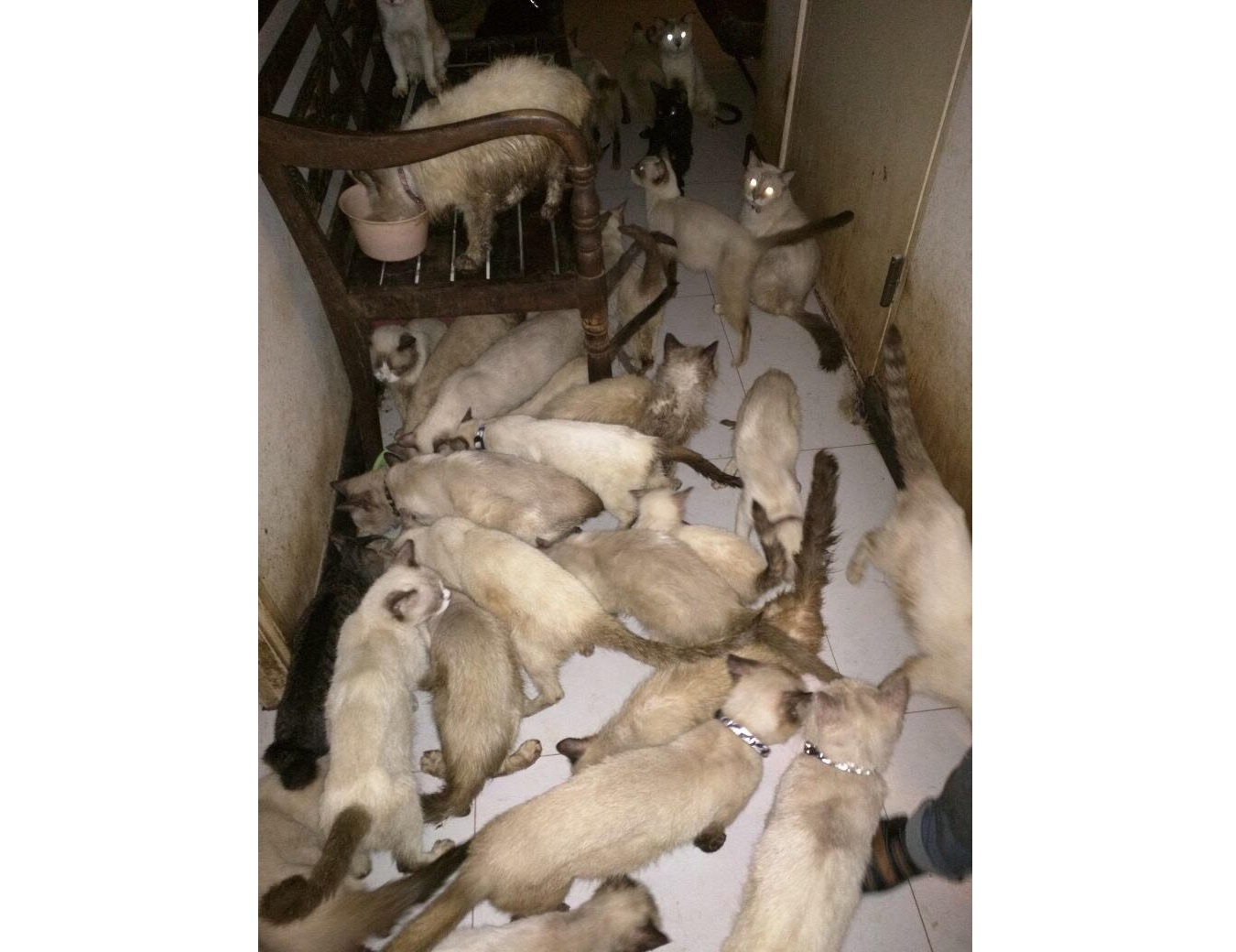 A total of 94 cats were rescued from a cat hoarder's home on Monday. Sixty-one of them are with cat group Saving The Siameses. Eighteen are with CWS and 15 are at the vet.