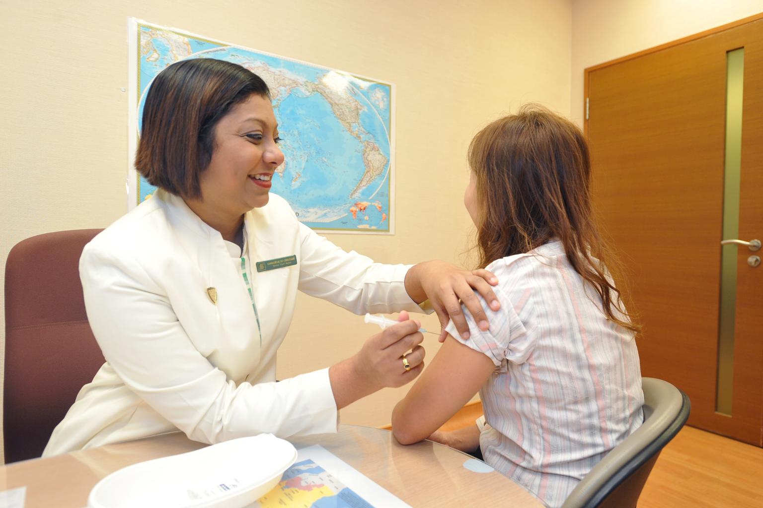 A file photo of senior staff nurse Asannachiyaar Chinnathamby, from the travel clinic at Singapore General Hospital, giving a vaccine injection to a patient in the clinic.