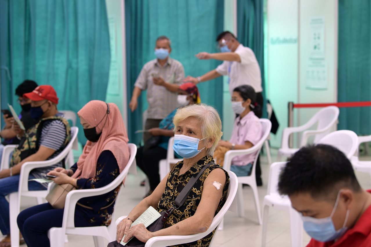 People waiting in the observation area at the Covid-19 vaccination centre at Marsiling Community Club after receiving their jabs on June 1, 2021.