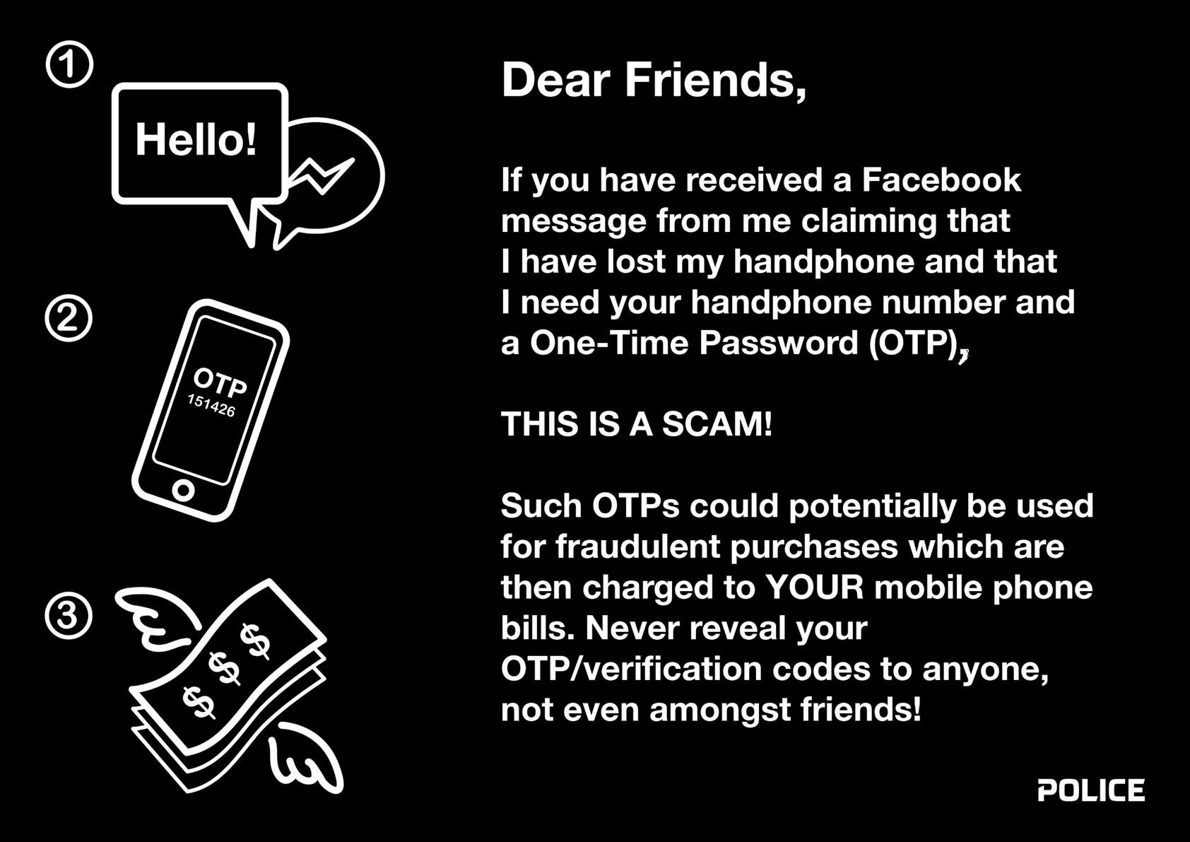 SINGAPORE - Watch out for scammers who ask for your phone number and passwords via Facebook messenger, the police said in a Facebook post on Monday (Jan 8).