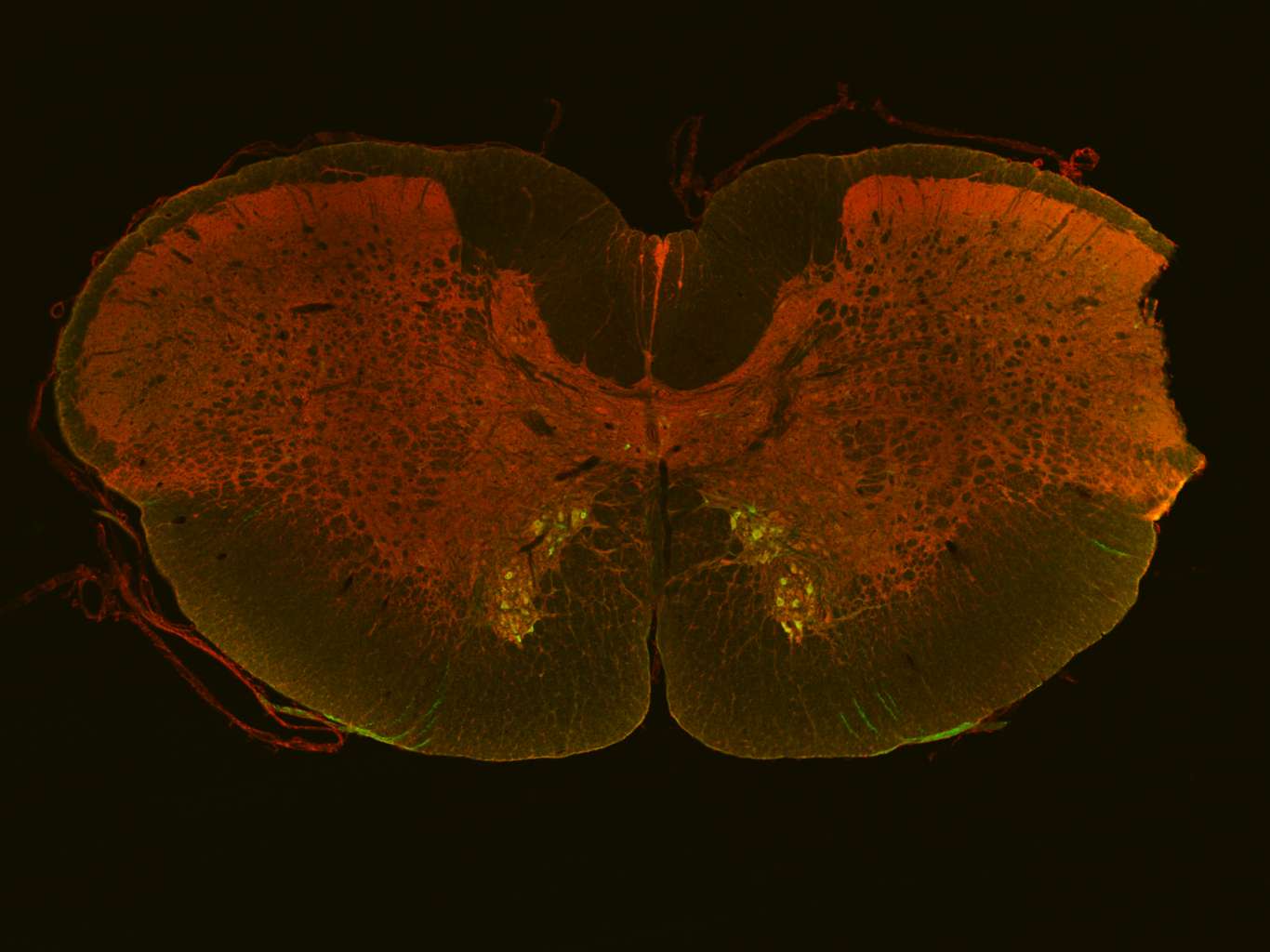 A section of spinal cord containing a protein called BNIP-H (stained red), magnified 20 times. Stained green is an enzyme called choline acetyltransferase. Researchers from the National University of Singapore (NUS) have discovered that the BNIP-H protein is linked to Cayman ataxia, a rare genetic disorder which affects a region of the brain involved in motor control. The disorder leads to difficulty in coordinating complex movements. Associate Professor Low Boon Chuan and postdoctoral scientist Sun Jichao, from the Department of Biological Sciences and Mechanobiology Institute at NUS, found that the protein regulates the growth of nerve cells by transporting key metabolic enzymes to the tips of neural cells.