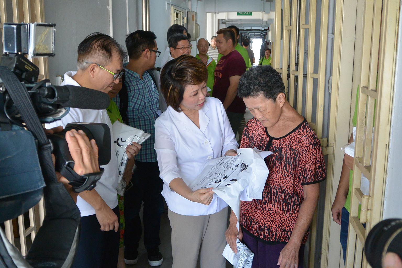 Dr Lily Neo, MP for Jalan Besar GRC and Chairman of Jalan Besar Town Council, distributing the trash bags to residents in Block 2 Jalan Kukoh.