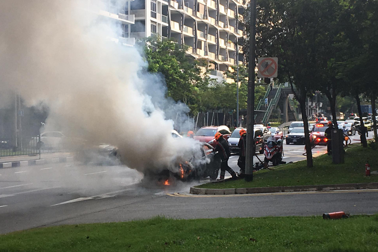 Photos of the incident show at least four Singapore Civil Defence Force personnel extinguishing the fire from the black Toyota sedan.