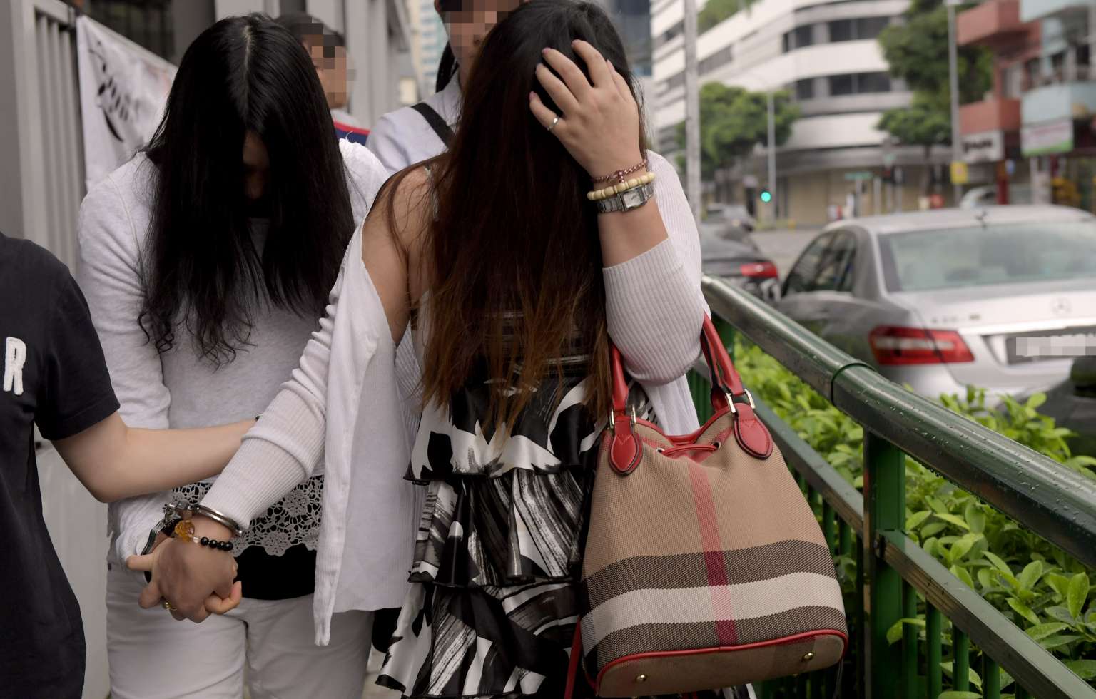 Two women from a TCM outlet in Rangoon Road being taken away after a police raid.