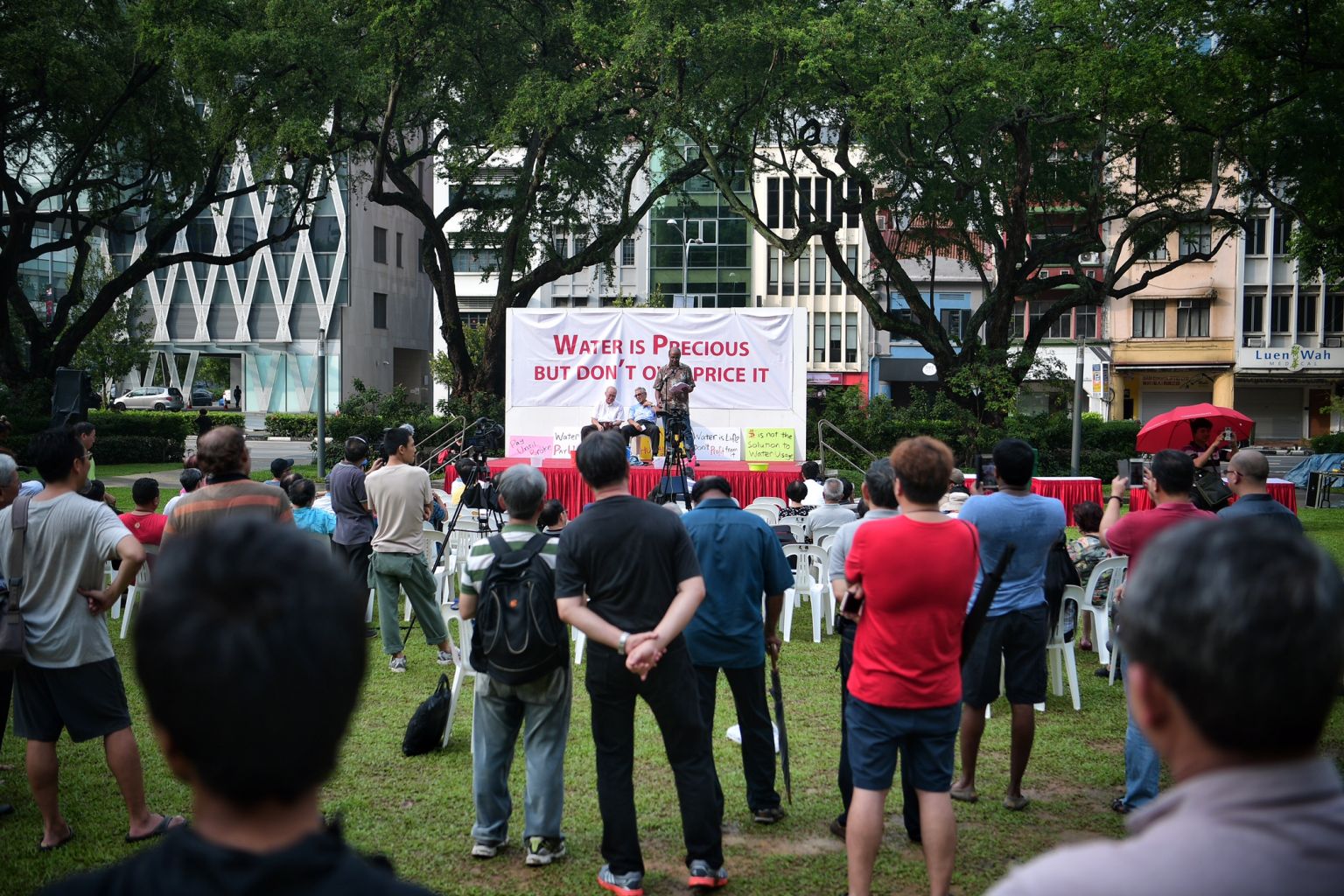 The crowd watches as Dr Paul Tambyah speaks during the water price hike protest at Hong Lim Park, on March 11, 2017.