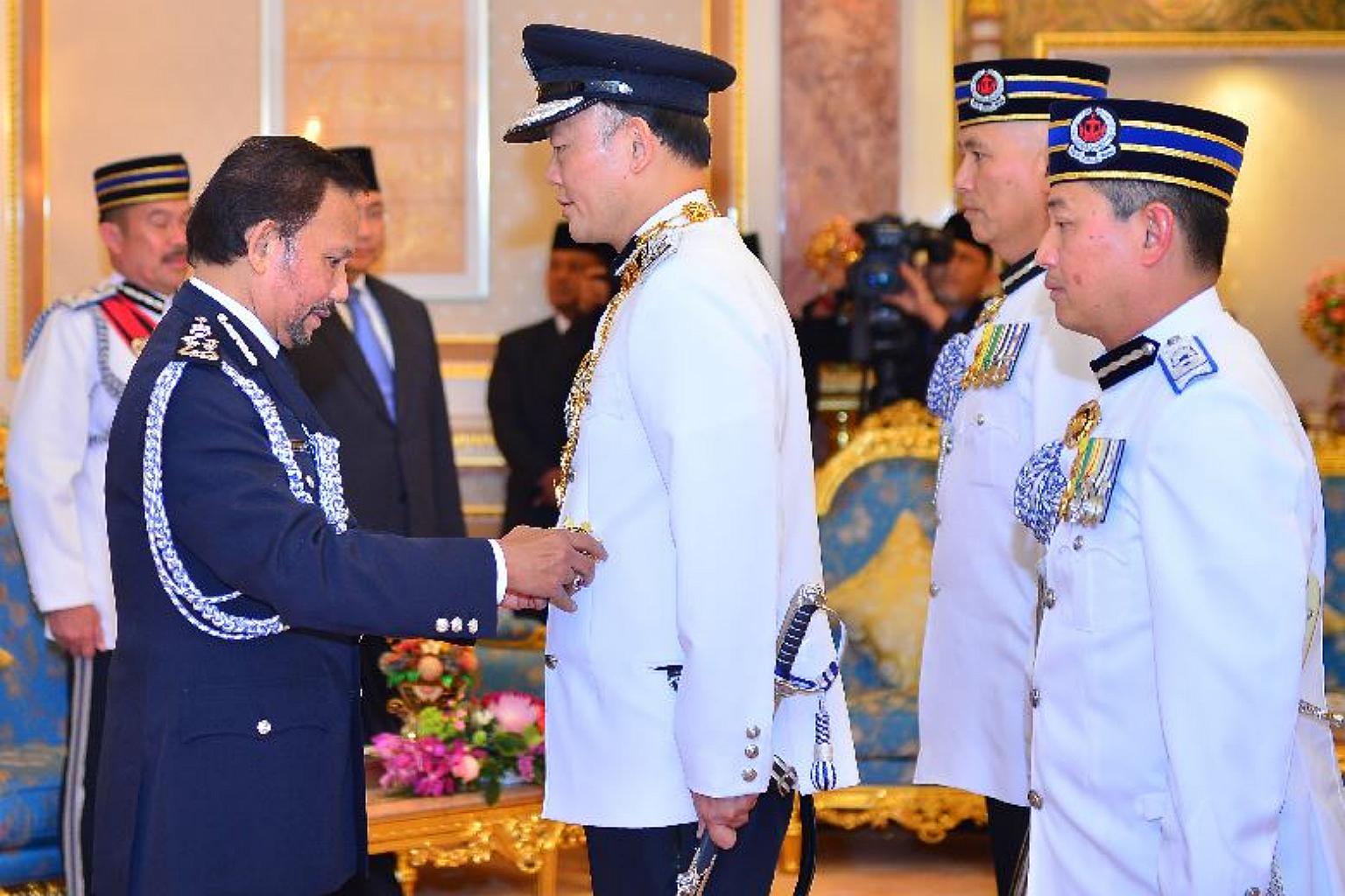 Sultan of Brunei Hassanal Bolkiah presents Commissioner of Police Hoong Wee Teck with the state award.