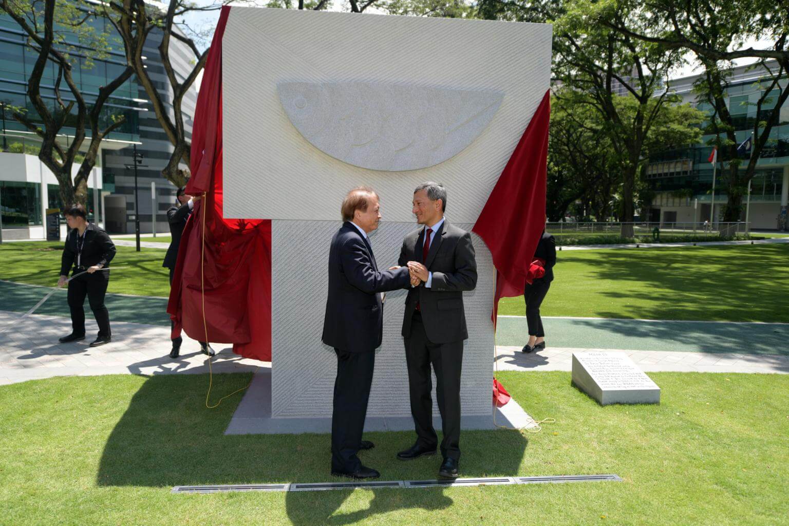 Dr Vivian Balakrishnan (right), Minister for Foreign Affairs, and artist Tan Swie Hian unveil a granite sculpture titled Asean50, to mark the golden jubilee of Asean, on Oct 6, 2017
