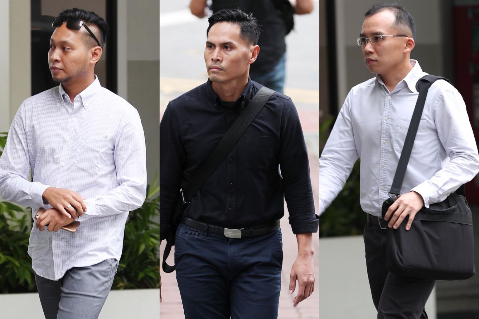 Witness Adighazali Suhaimi (far left) said he offered "brotherly advice" to Corporal Kok Yuen Chin on the night he drowned in the pump well. Nazhan Mohamed Nazi (centre), a first senior warrant officer, was the deputy rota commander, while Kenneth Chong Chee Boon (right), a lieutenant, was the rota commander that night.
