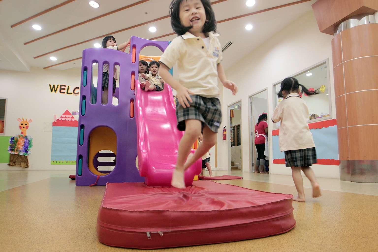 Pre-schoolers having fun in the indoor play area of Just Kids Learning Place childcare centre in Yishun.