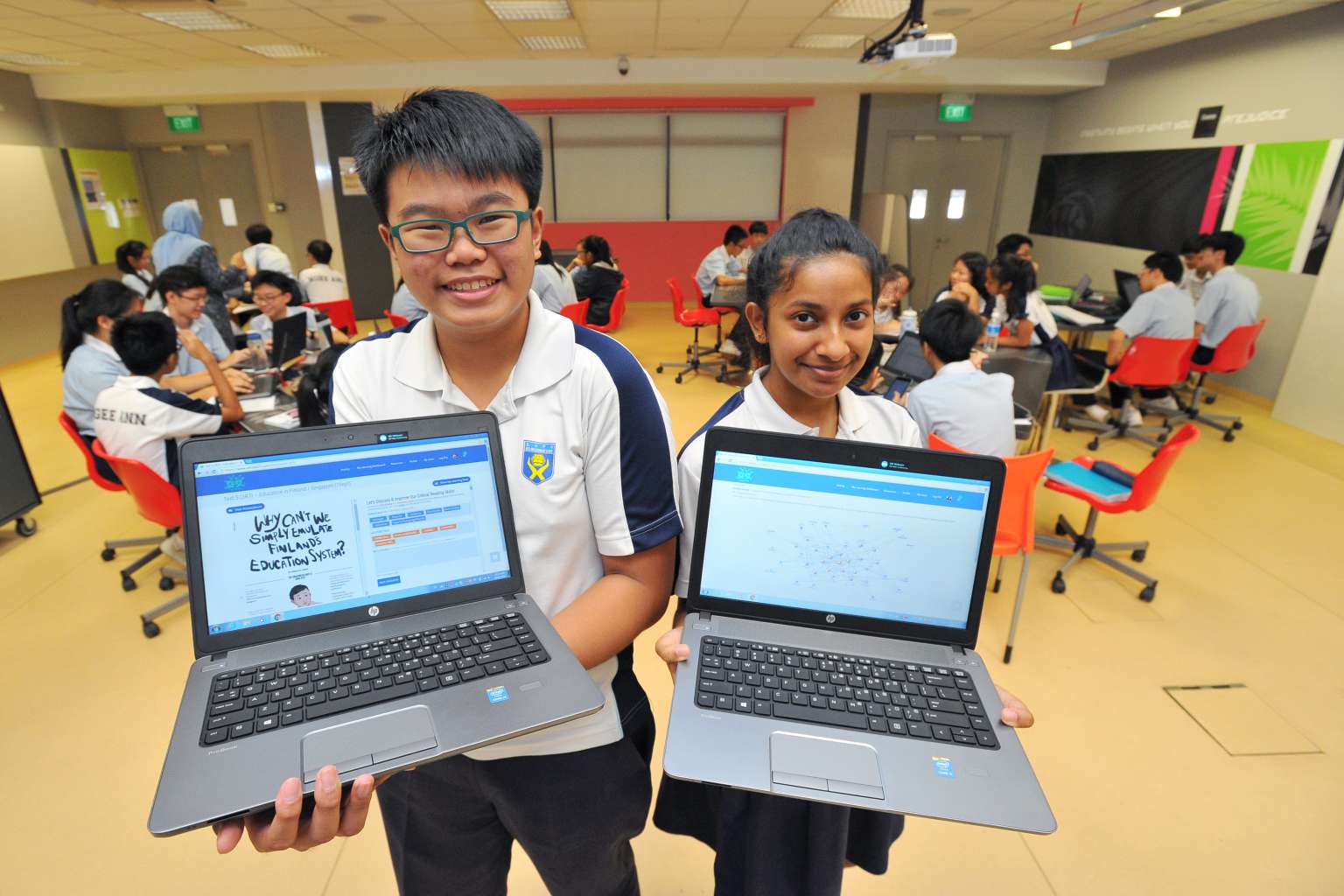 Ngee Ann Secondary students Sean Lam (left) and Maya Sri Dewi were part of the Web-based reading and learning analytics programme last year.
