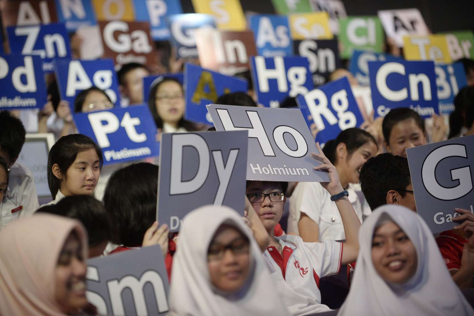 Students holding up cards with symbols from the periodic table during a lecture at the Singapore Science Centre on July 30, 2013.