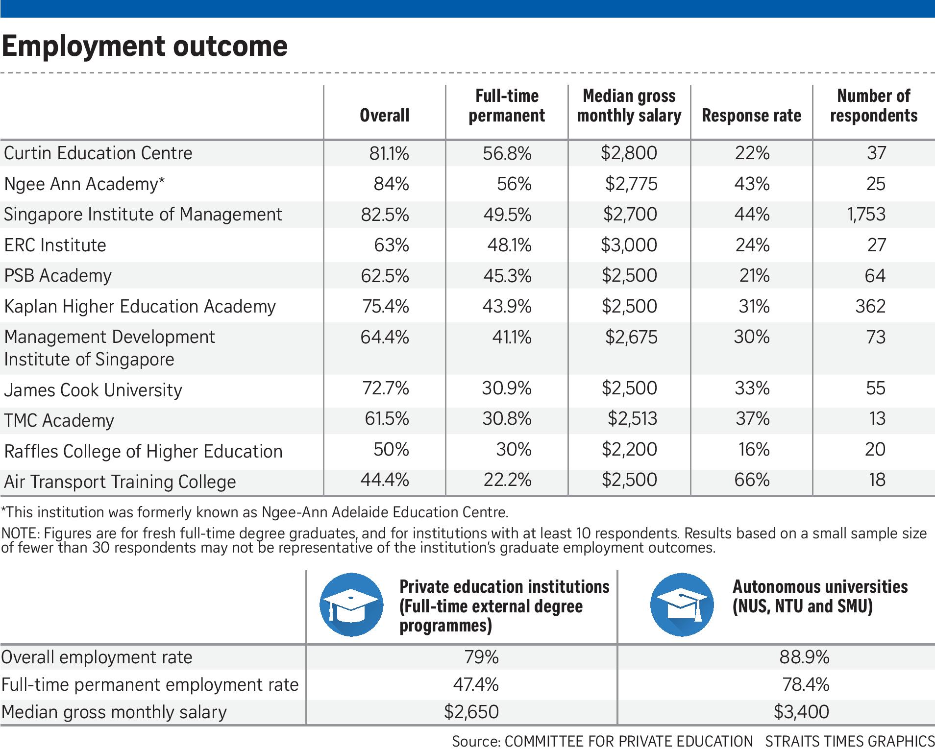 These results come after the first survey of private school graduates by the committee came out in November last year. It found that six in 10 of their graduates were hired full-time six months after completing their studies. Their median starting pay was $2,550 a month.
