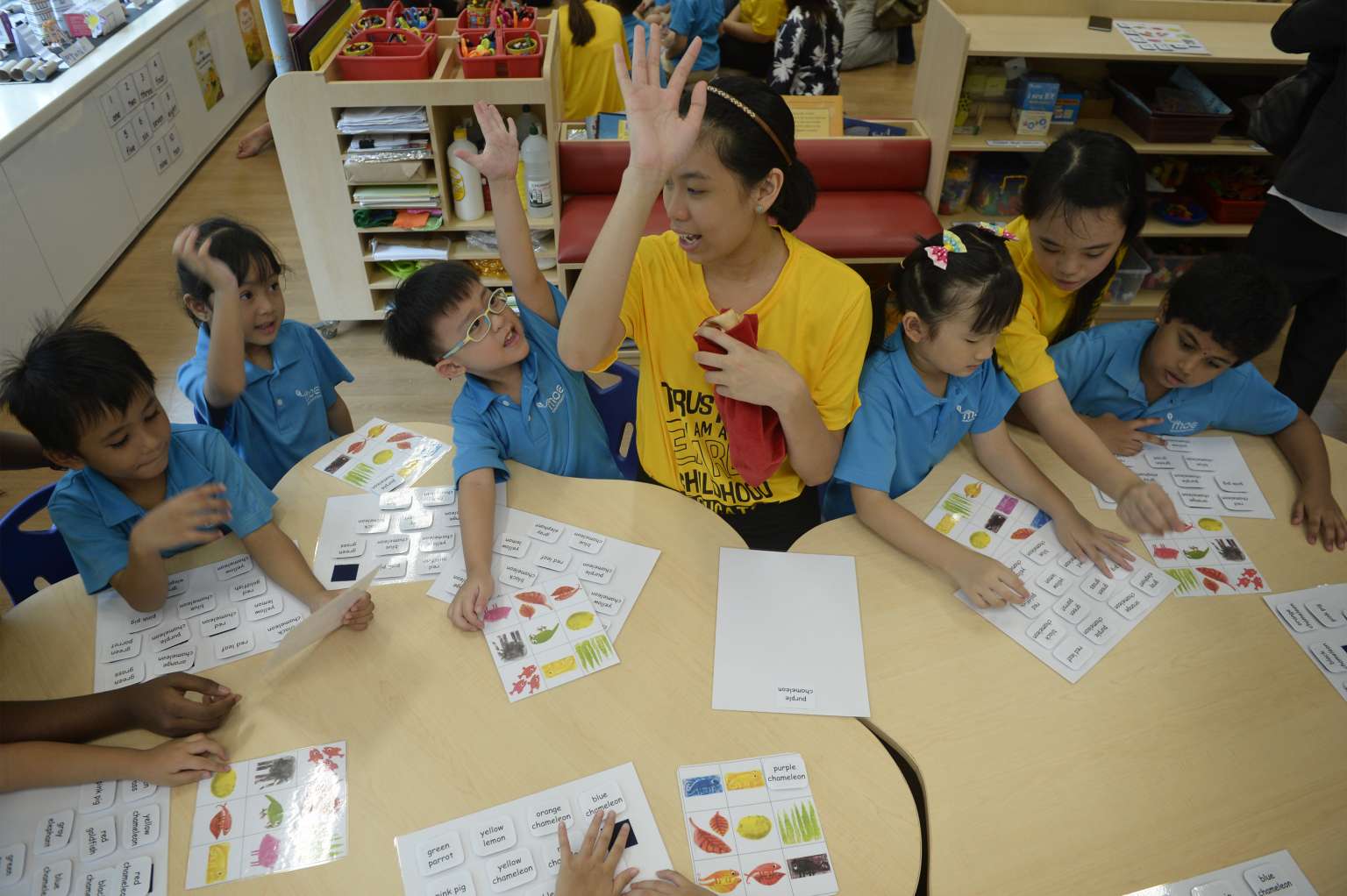 Educators playing bingo with children at a kindergarden.